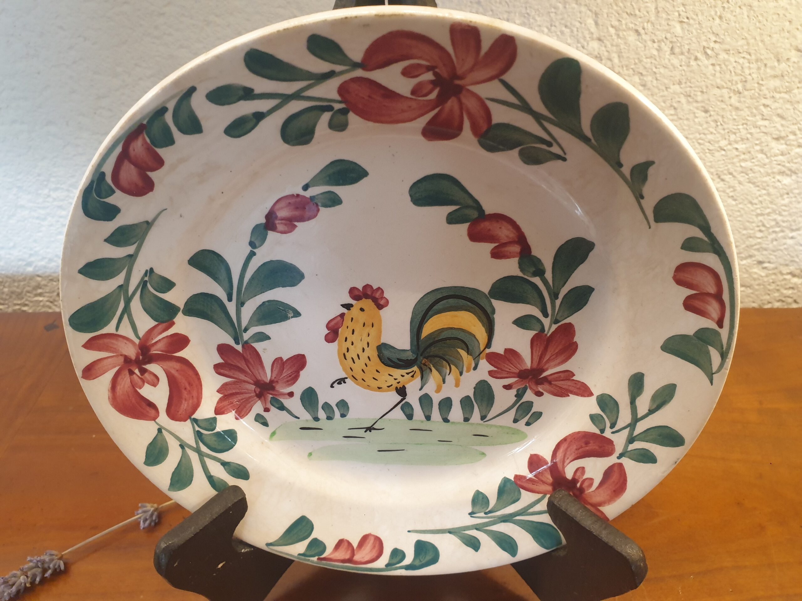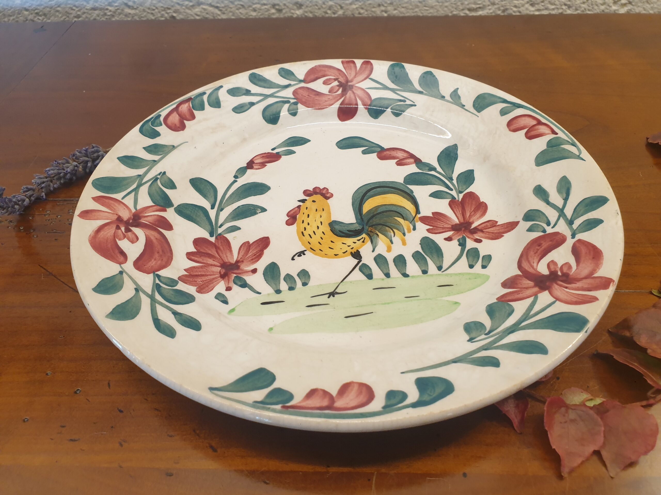 L’assiette arbore un motif central représentant un coq majestueux, symbole de la tradition française, entouré de fleurs éclatantes. Ce décor peint avec soin évoque les arts de la table d’autrefois et apporte une note chaleureuse et vivante à vos présentations.