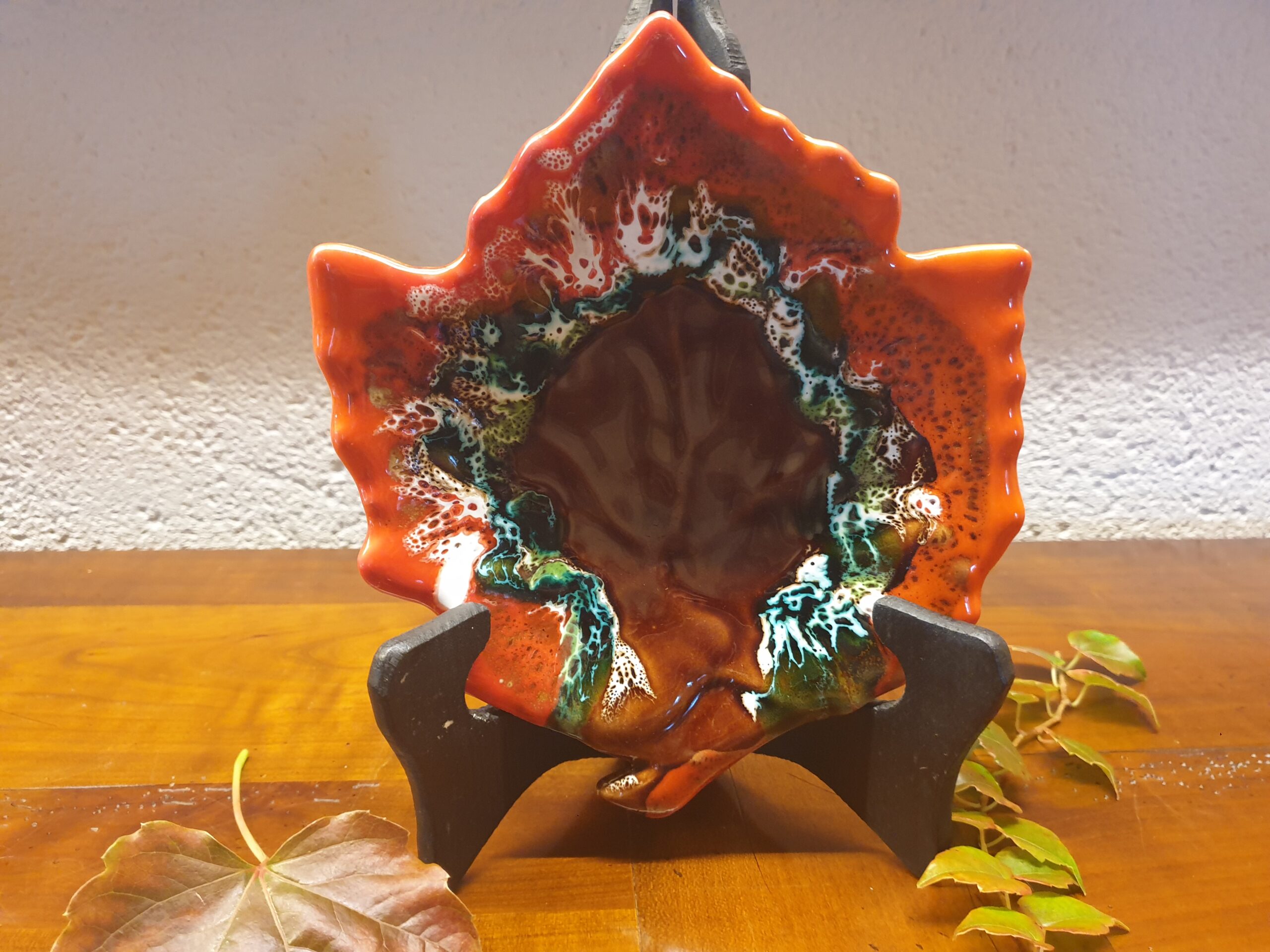 Sa forme de feuille, finement travaillée, évoque l’élégance organique et le charme des pièces des années 50-60. Son relief délicatement sculpté accentue le jeu de lumière et met en valeur son émail brillant.