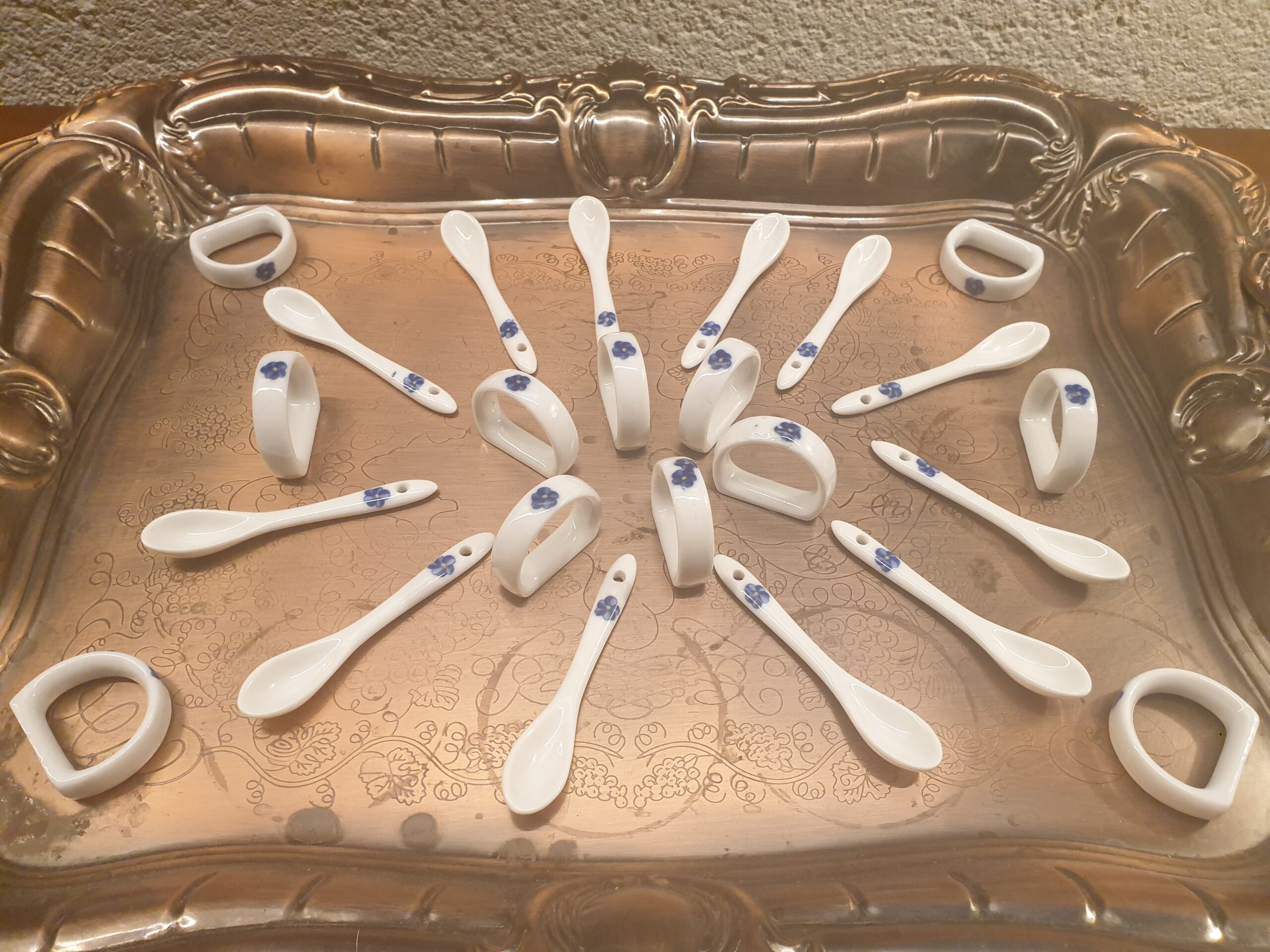 Ces porte-couteaux et ronds de serviette, décor de table en porcelaine incarnent le raffinement et la finesse des arts de la table. Leur décor délicat de petites fleurs bleues apporte une touche romantique et intemporelle à chaque repas. Idéals pour embellir une table et sublimer une décoration classique ou champêtre.