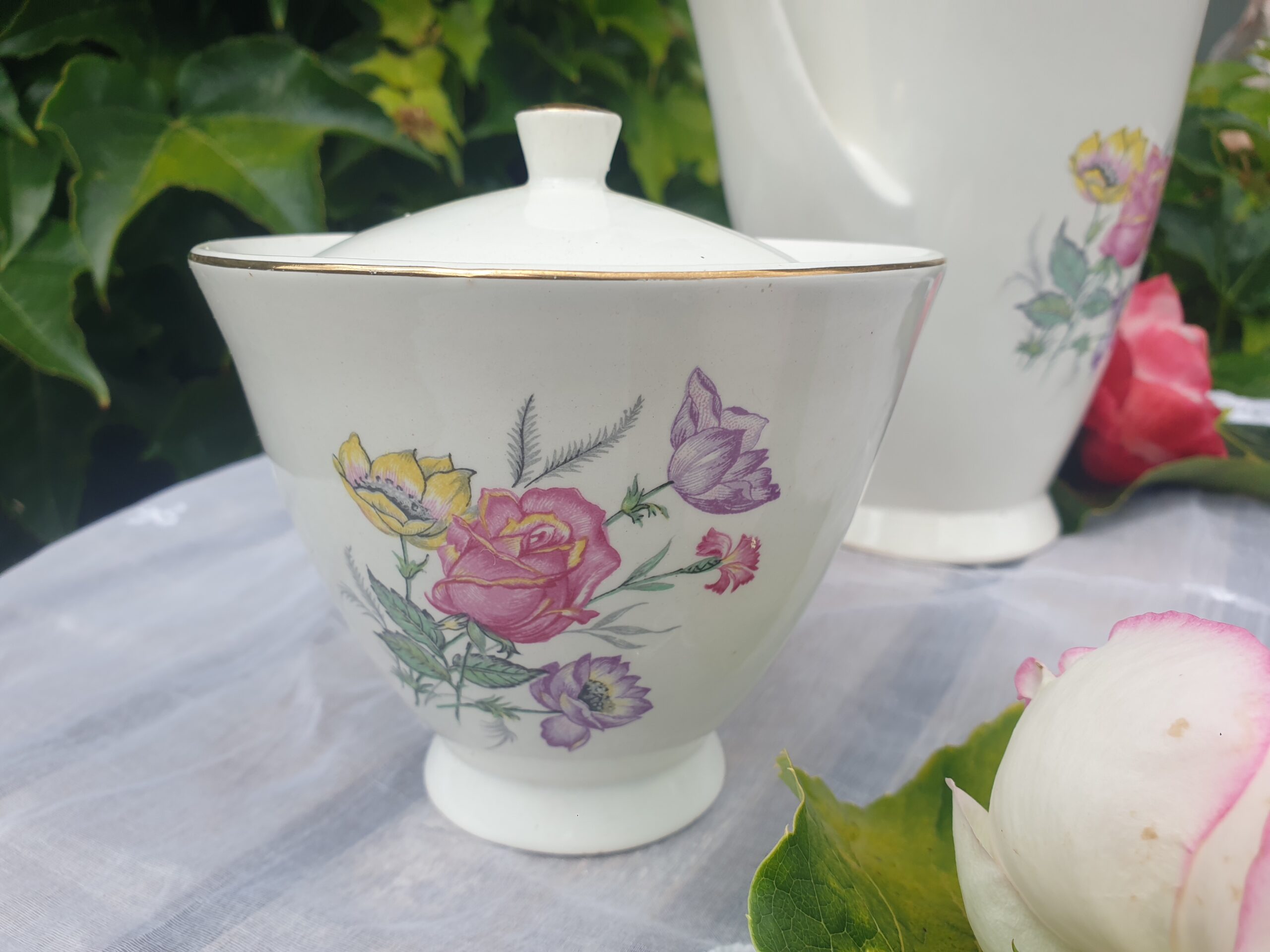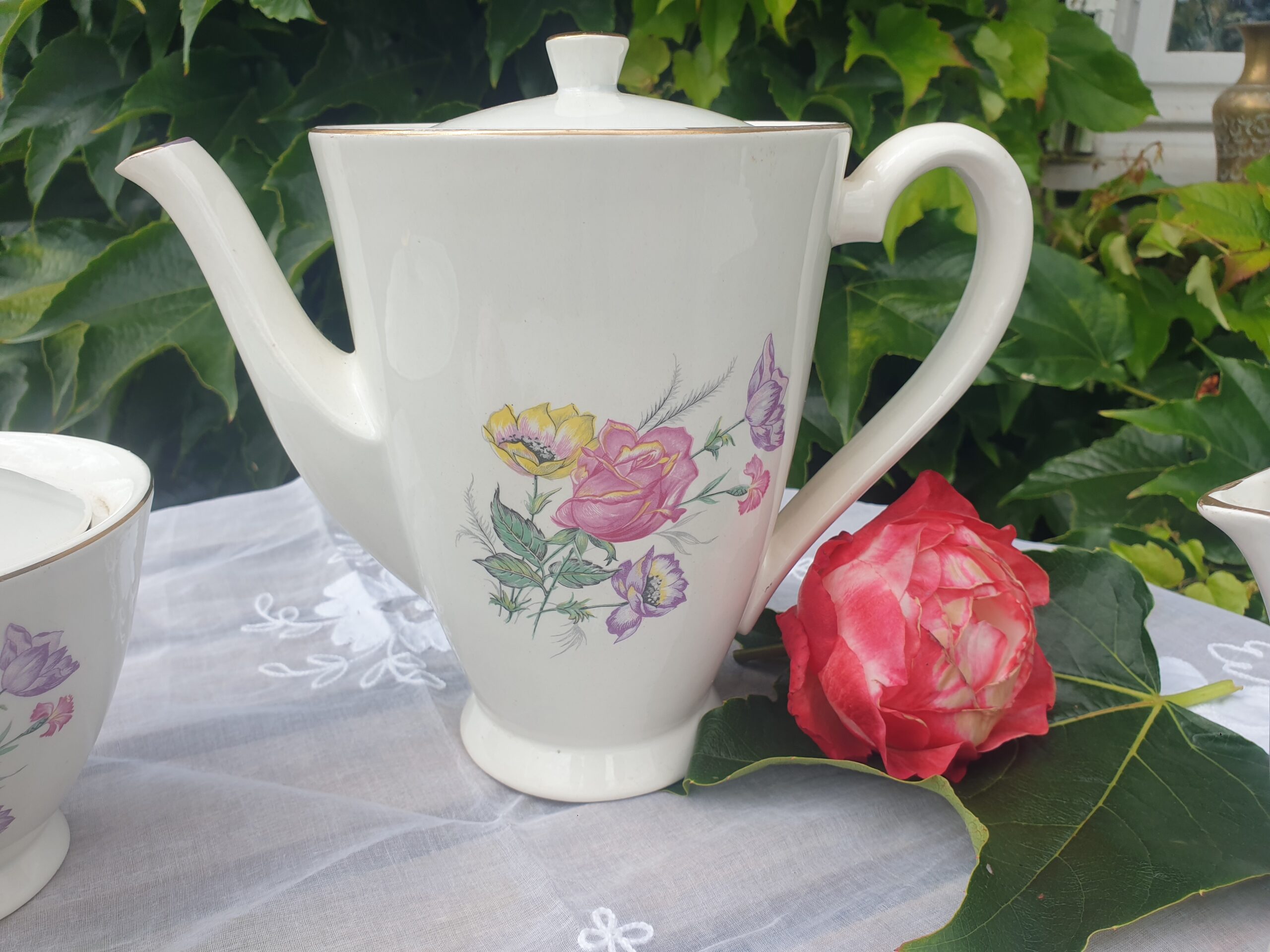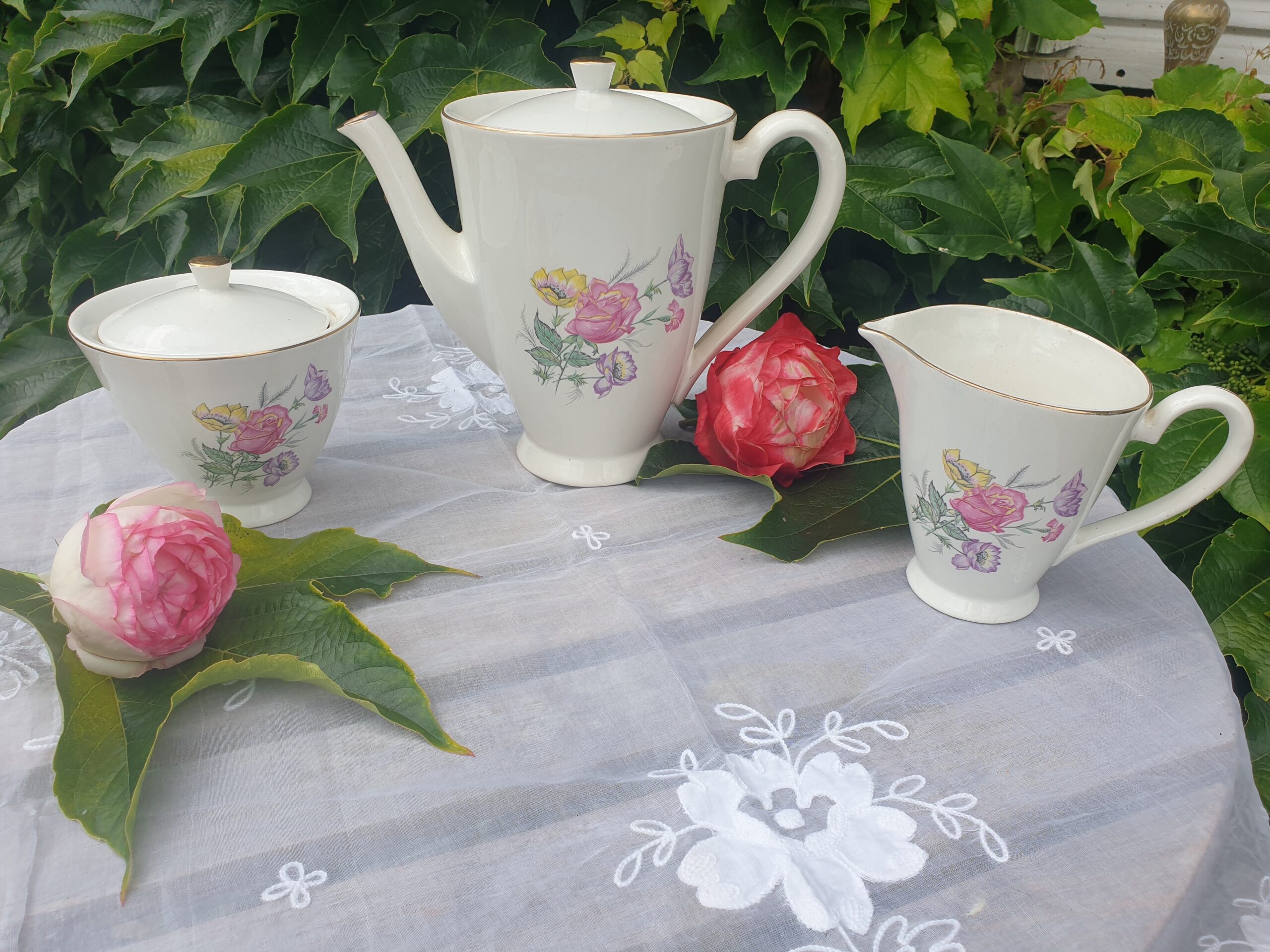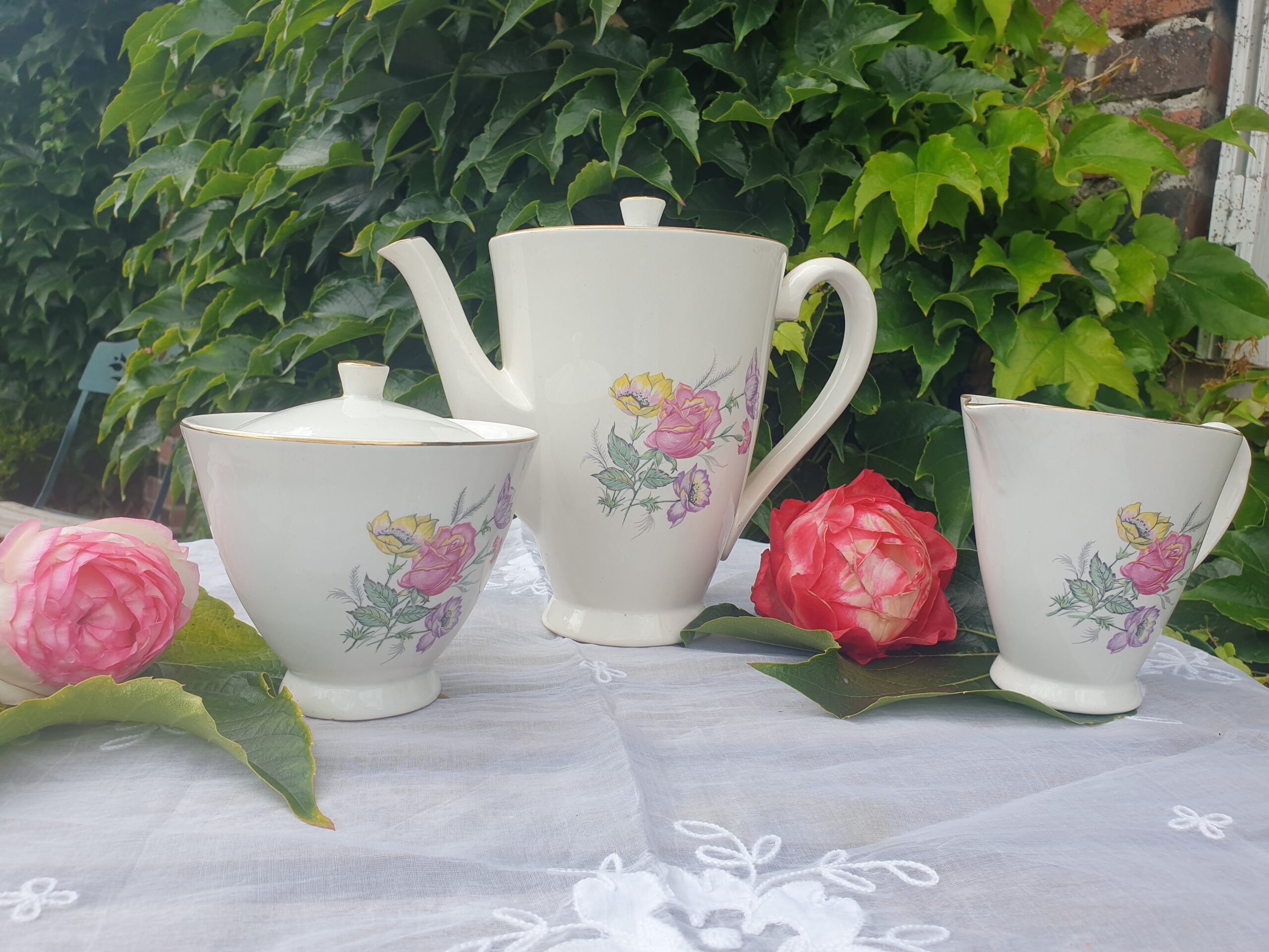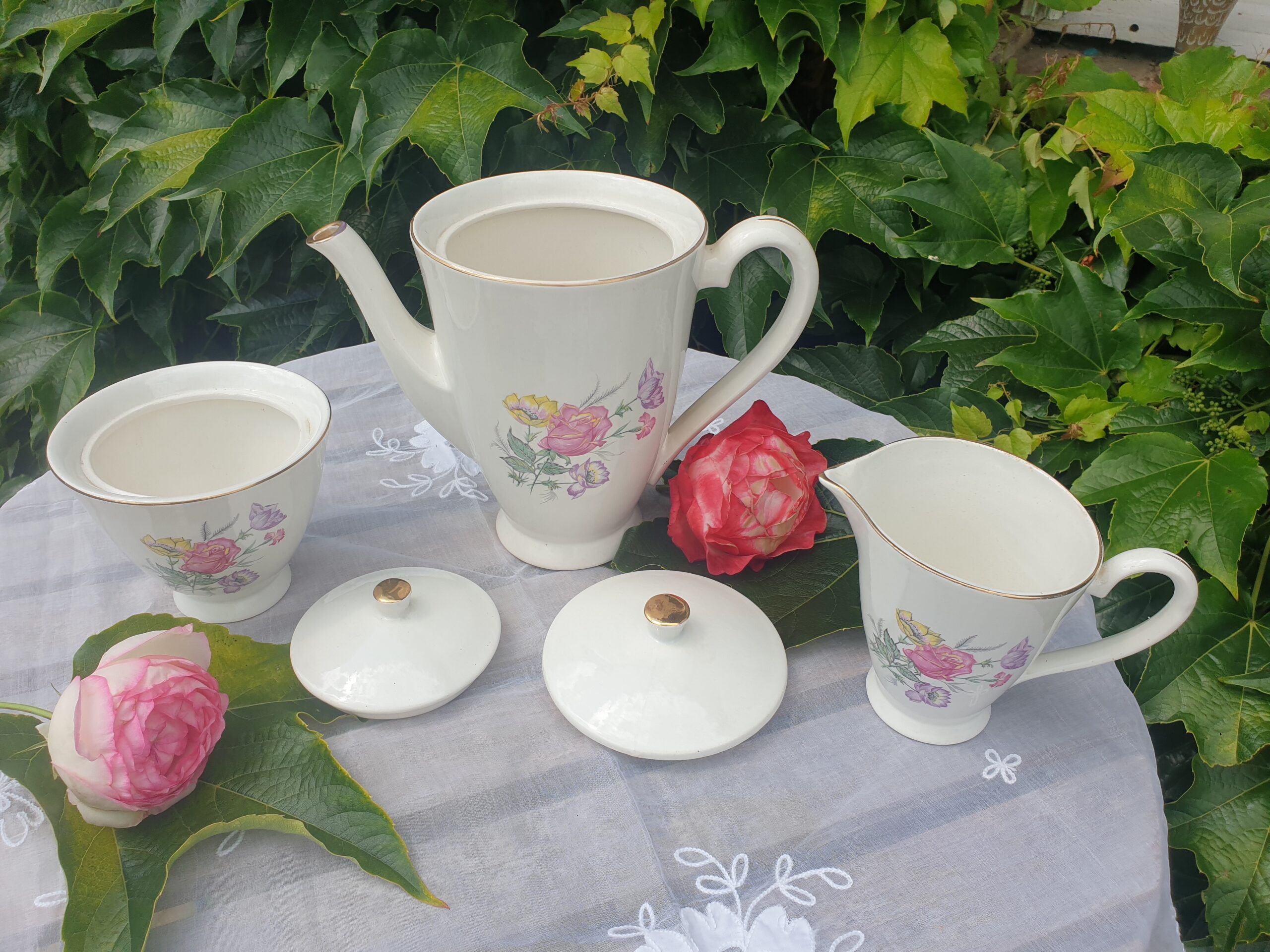 Ce trio est idéal pour accompagner vos moments de thé ou de café avec raffinement. La verseuse permet de servir avec aisance, le sucrier conserve élégamment les morceaux de sucre, et le pot à lait complète l’ensemble avec charme.
