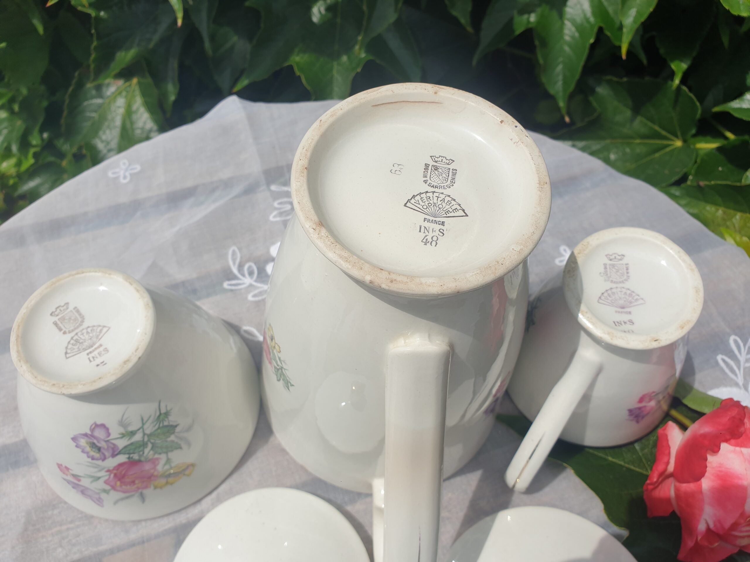 Fabriquées en faïence de qualité, ces pièces portent la signature réputée de Digoin & Sarreguemines, gage de savoir-faire et de tradition. Leur émail brillant met en valeur la finesse du décor floral et les lignes douces du service.