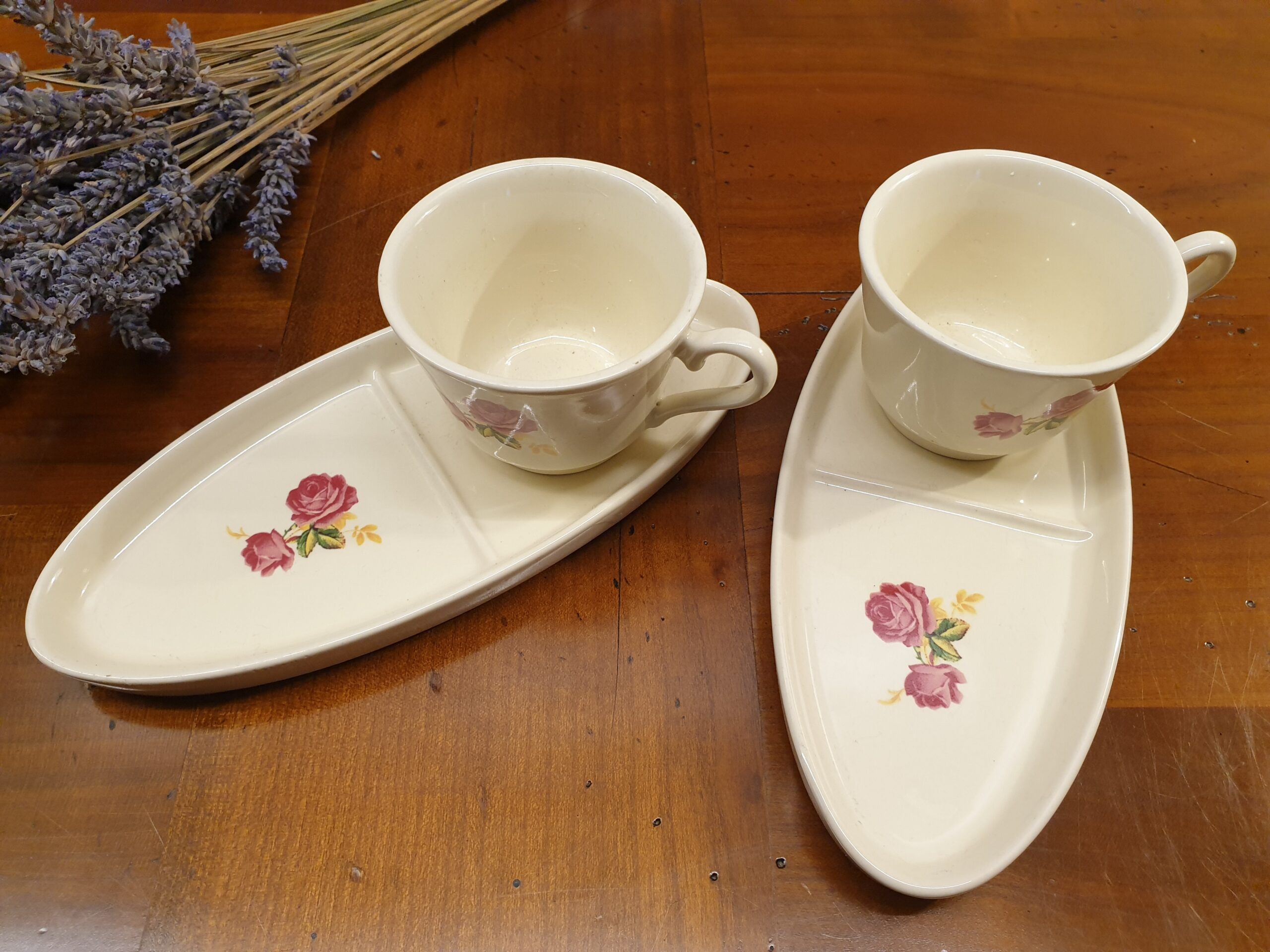 Les sous-tasses ont des formes ovales qui offrent un design élégant. Le contraste de la douceur des roses et la simplicité de la forme font de cet ensemble une véritable pièce de charme.
