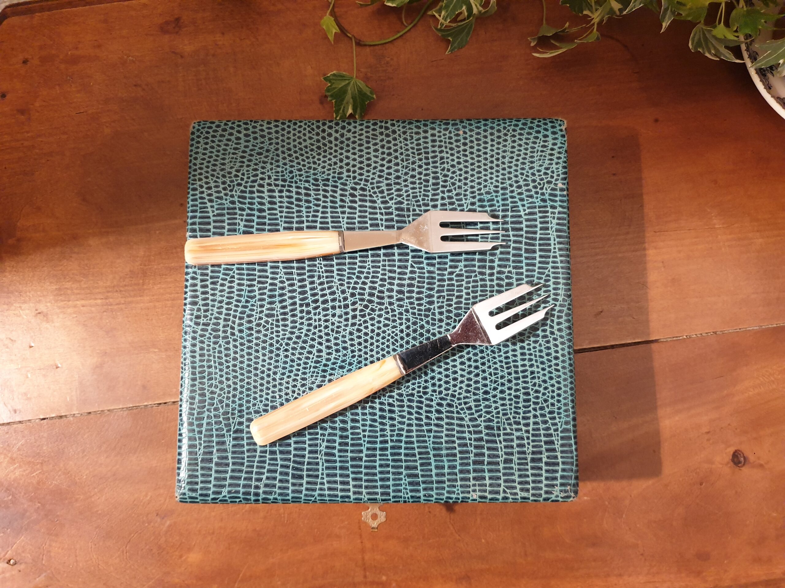 Cet ensemble de 12 fourchettes à dessert vintage, présenté dans son écrin d’origine, incarne l’élégance et le raffinement de l’art de la table à la française. Leur manche en bakélite ivoire, délicat et sophistiqué, apportera une touche de charme à vos repas.