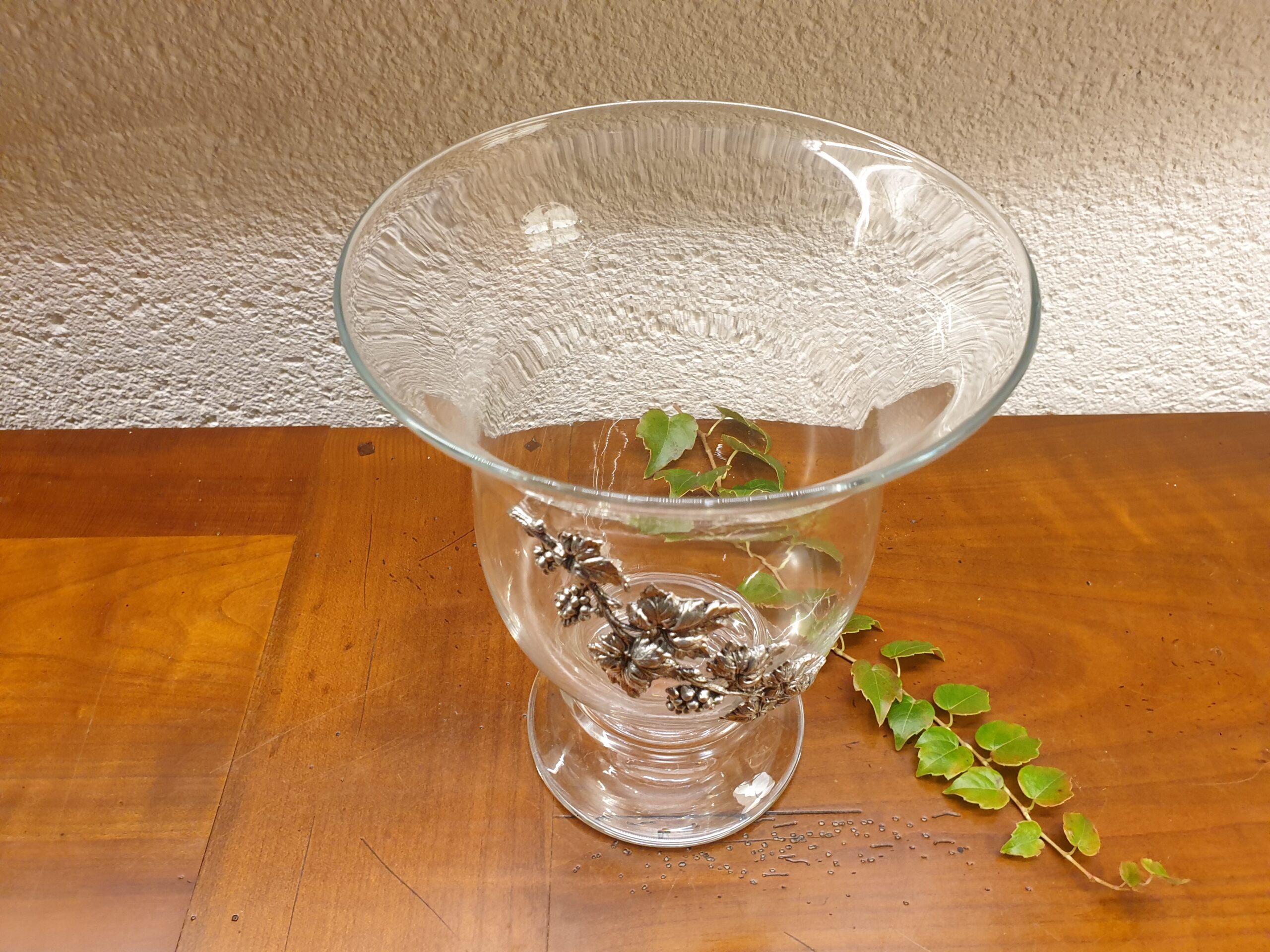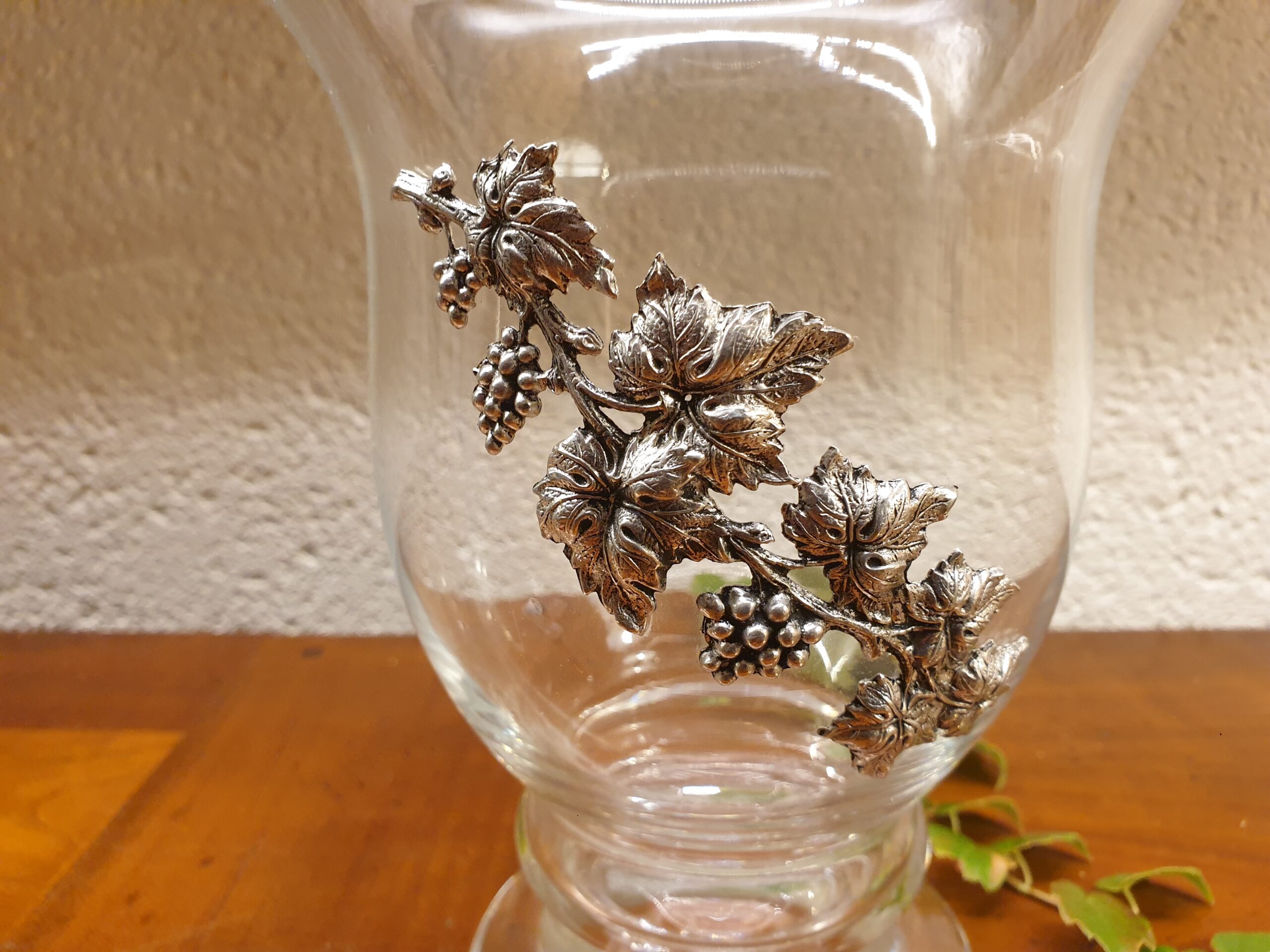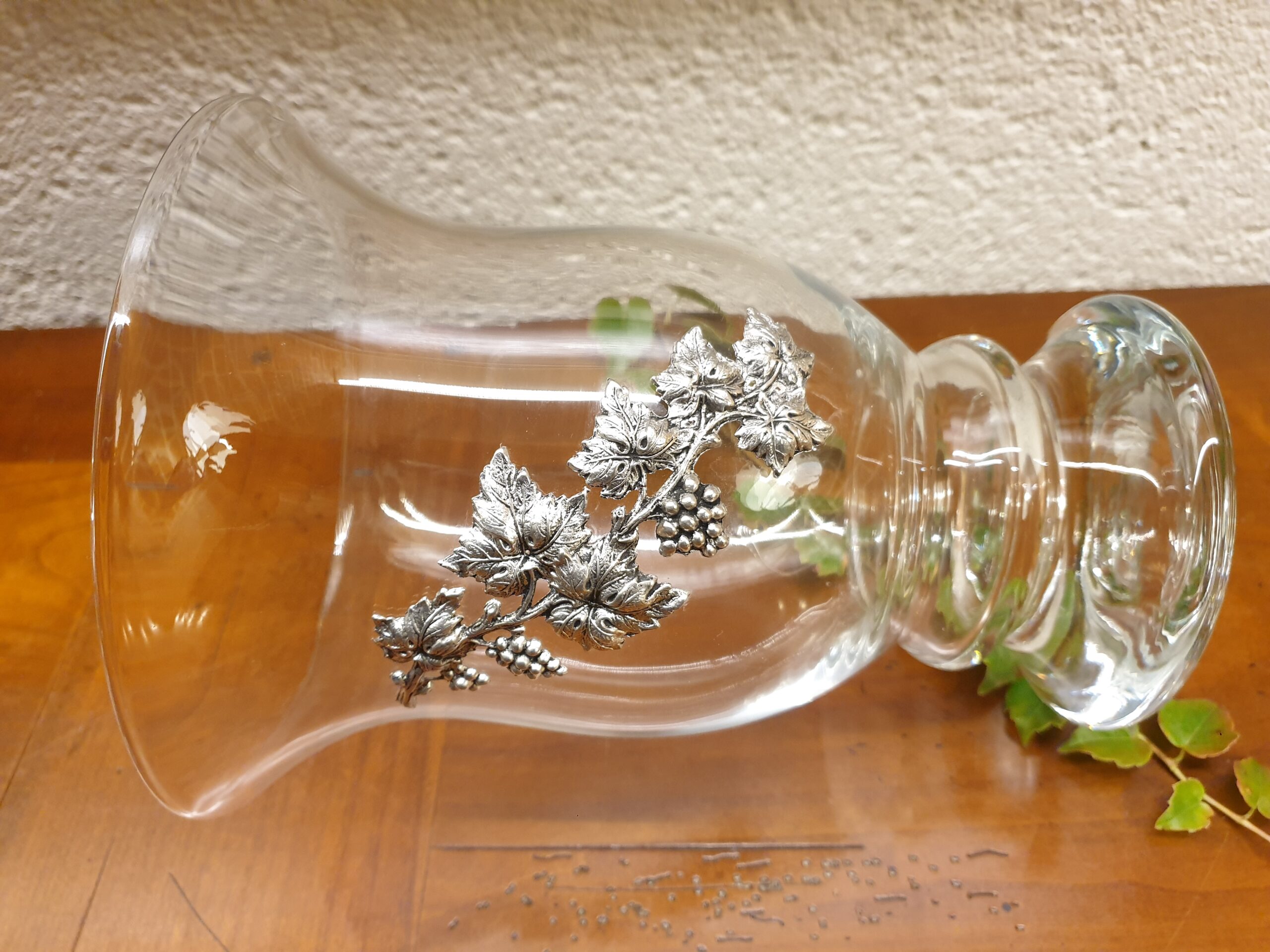 Le verre transparent met en valeur la finesse des détails de la grappe de raisin en étain. Ce contraste entre légèreté et robustesse confère à cette coupe une élégance unique.
