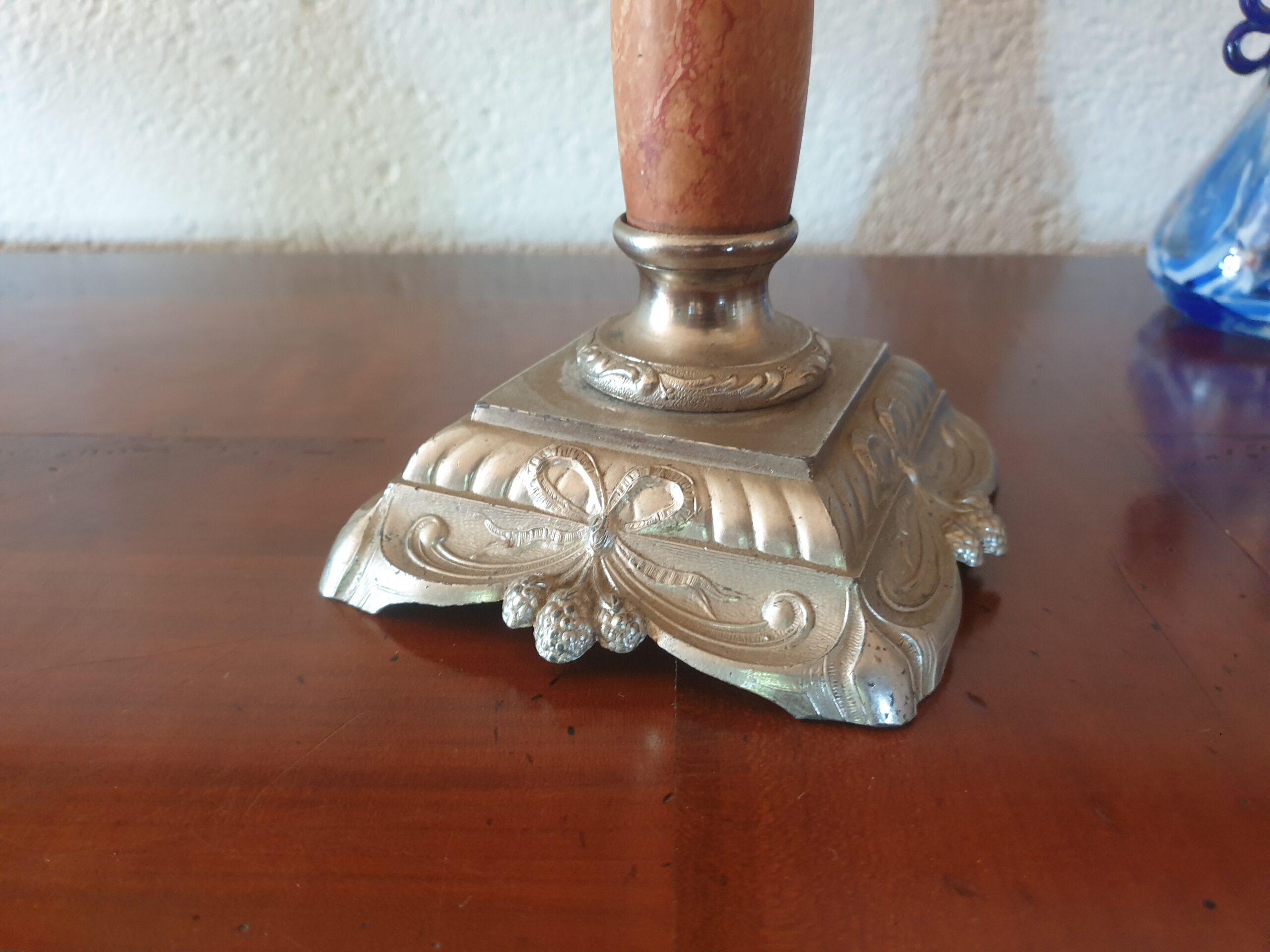 Décor : réservoir en verre ambré, pied en métal ciselé, colonne décorative