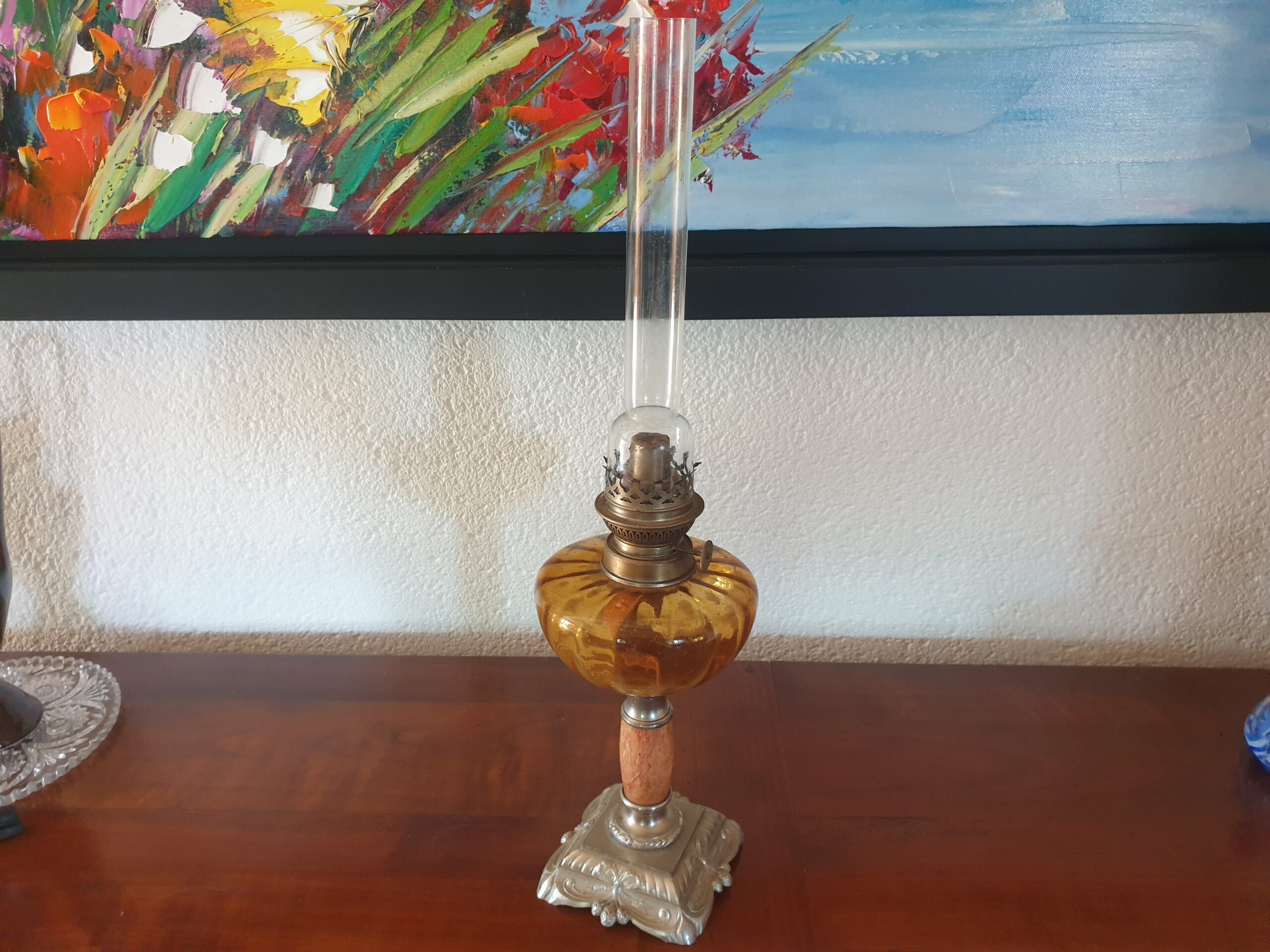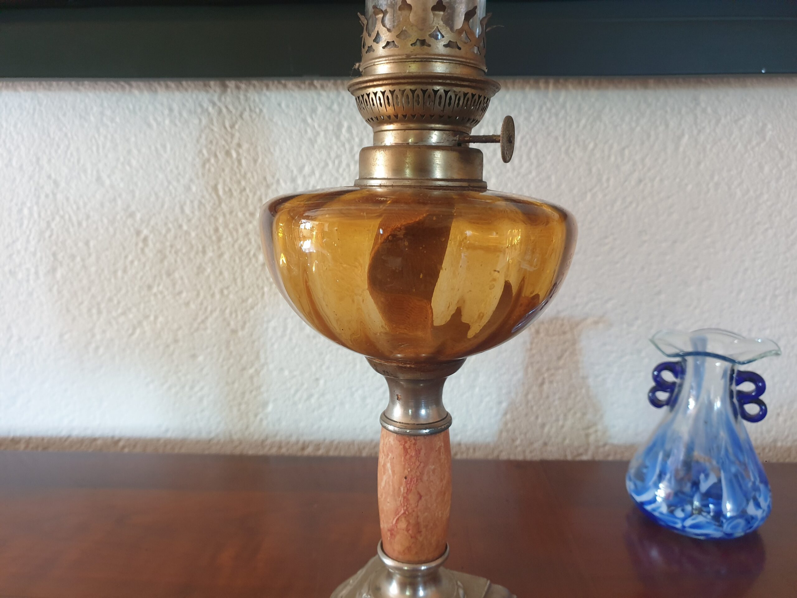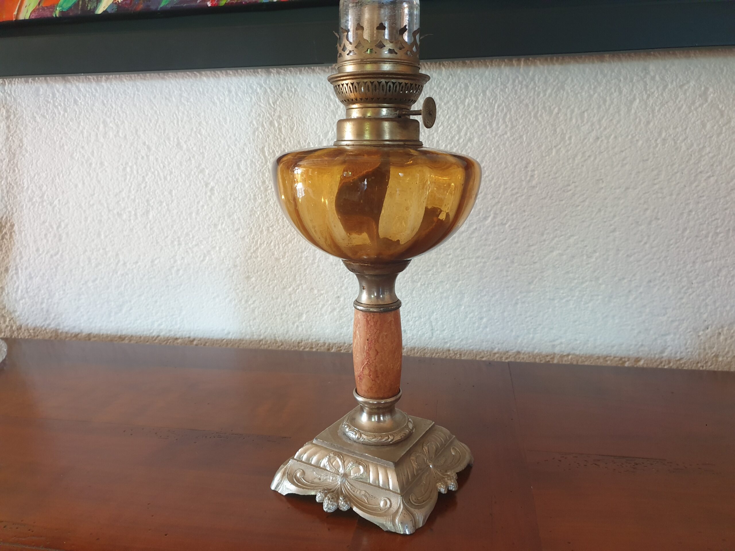 Lampe à pétrole ancienne – Verre ambré et pied orné : Lumière d’antan et élégance intemporelle