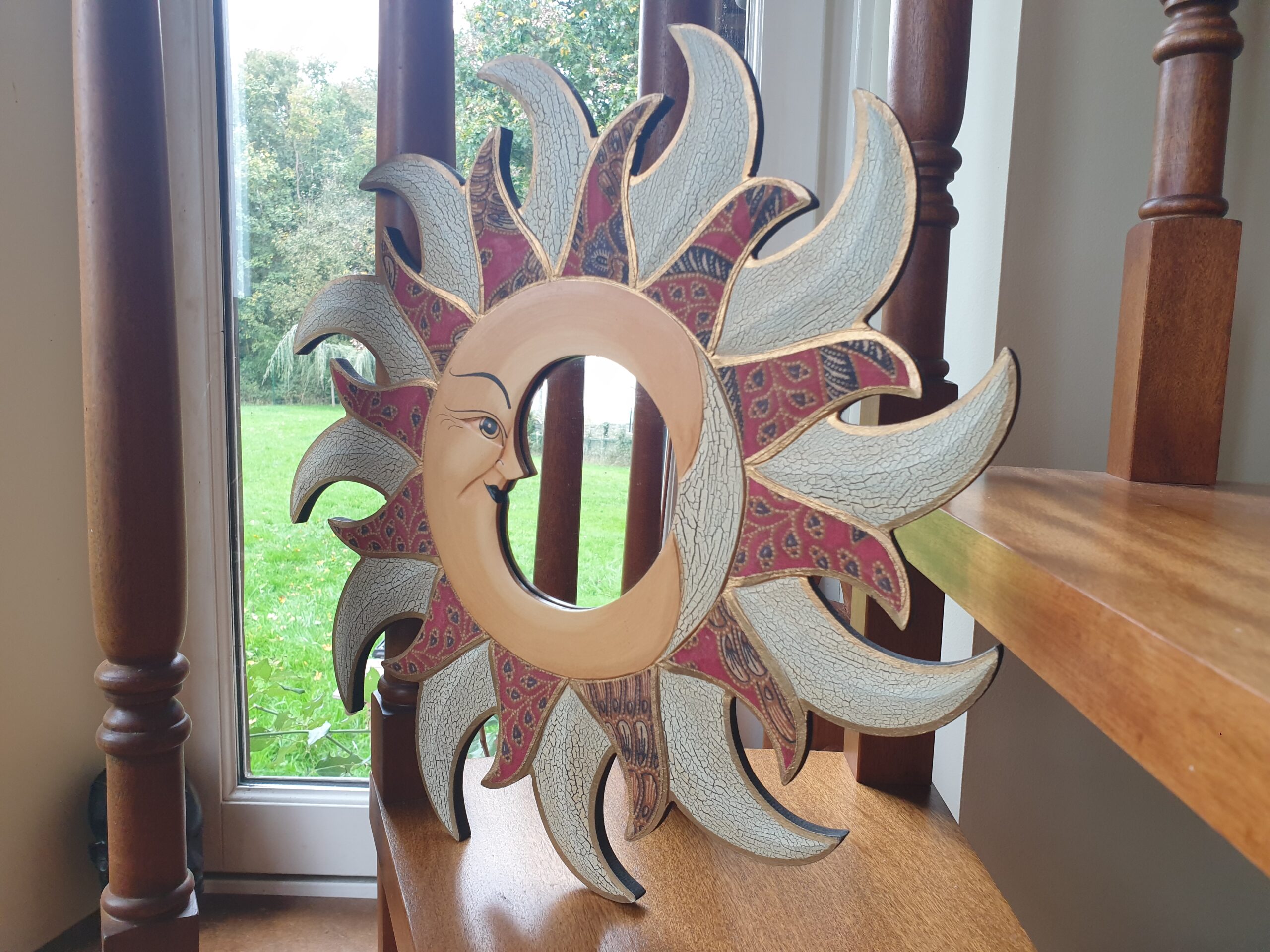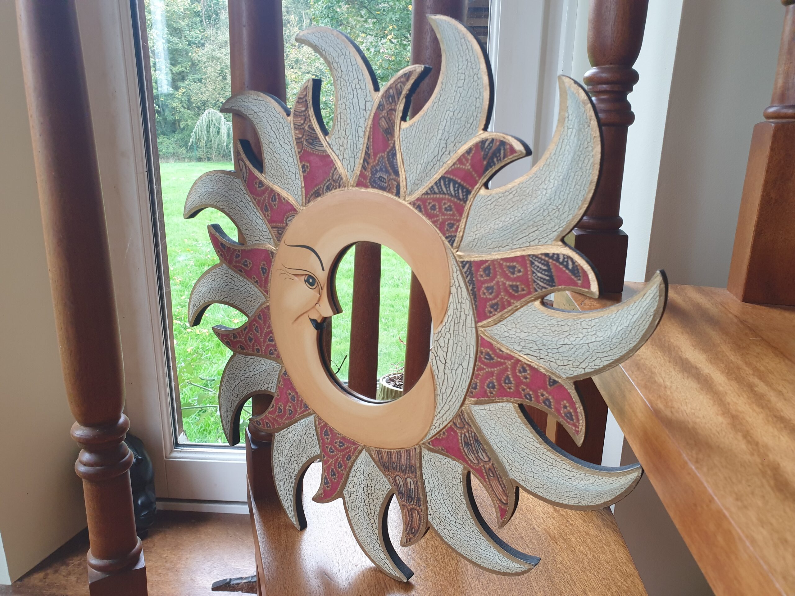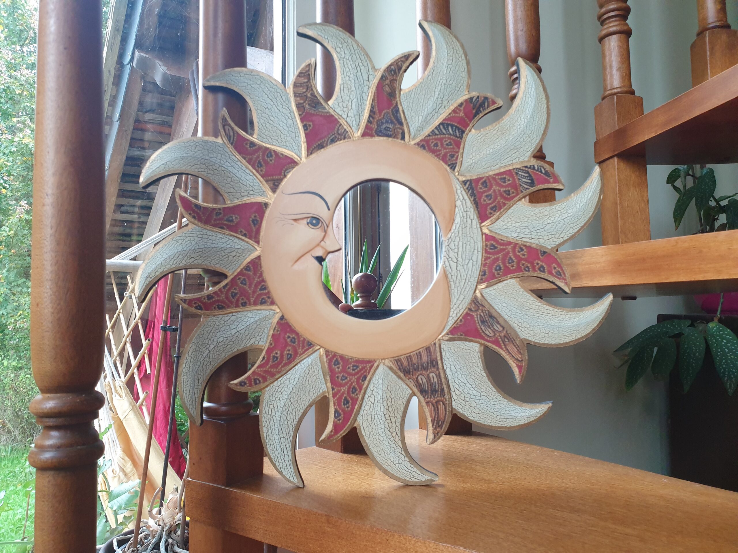 Miroir en Bois en Forme de Soleil et Lune : Une Pièce Unique et Éclatante