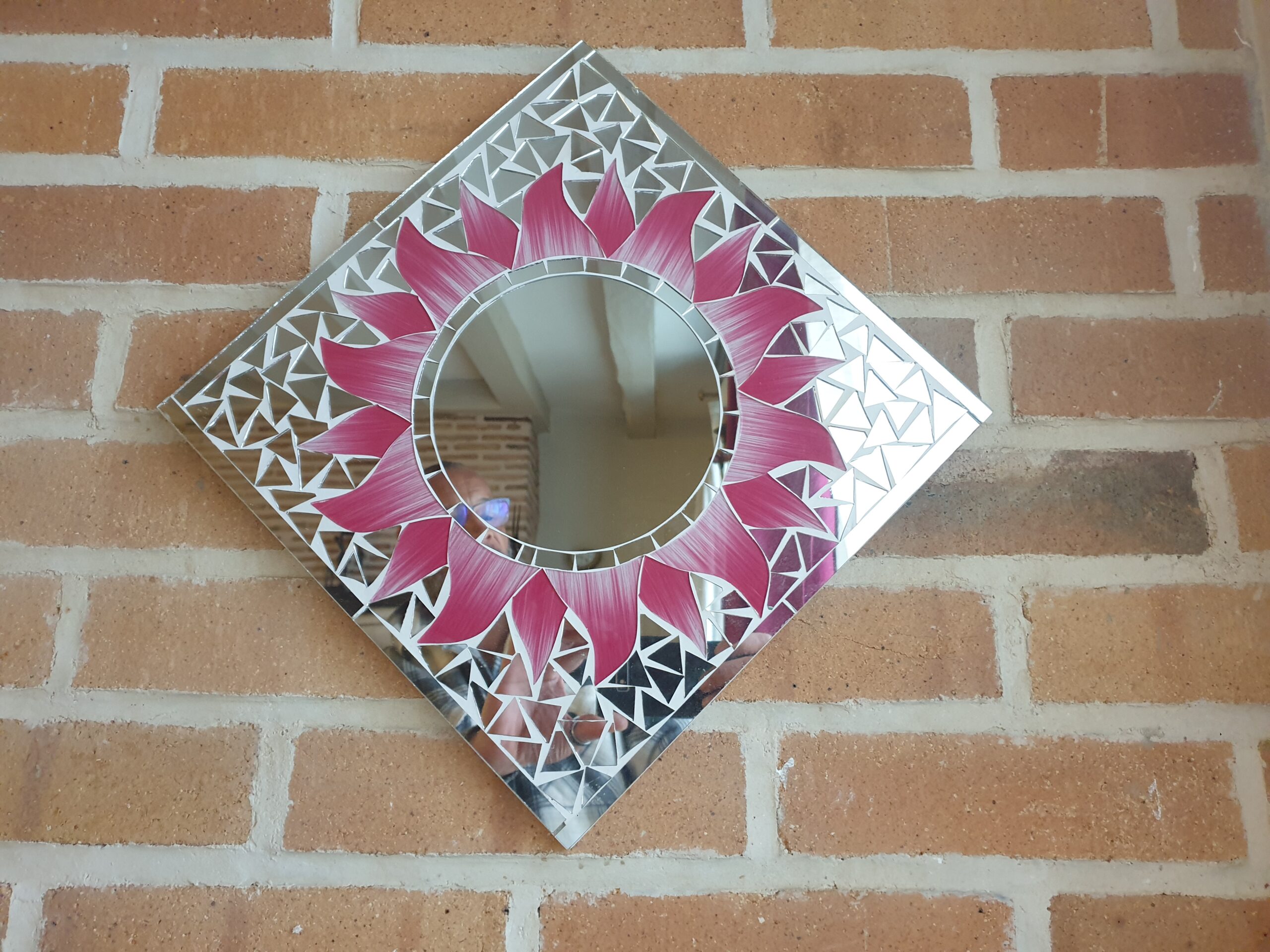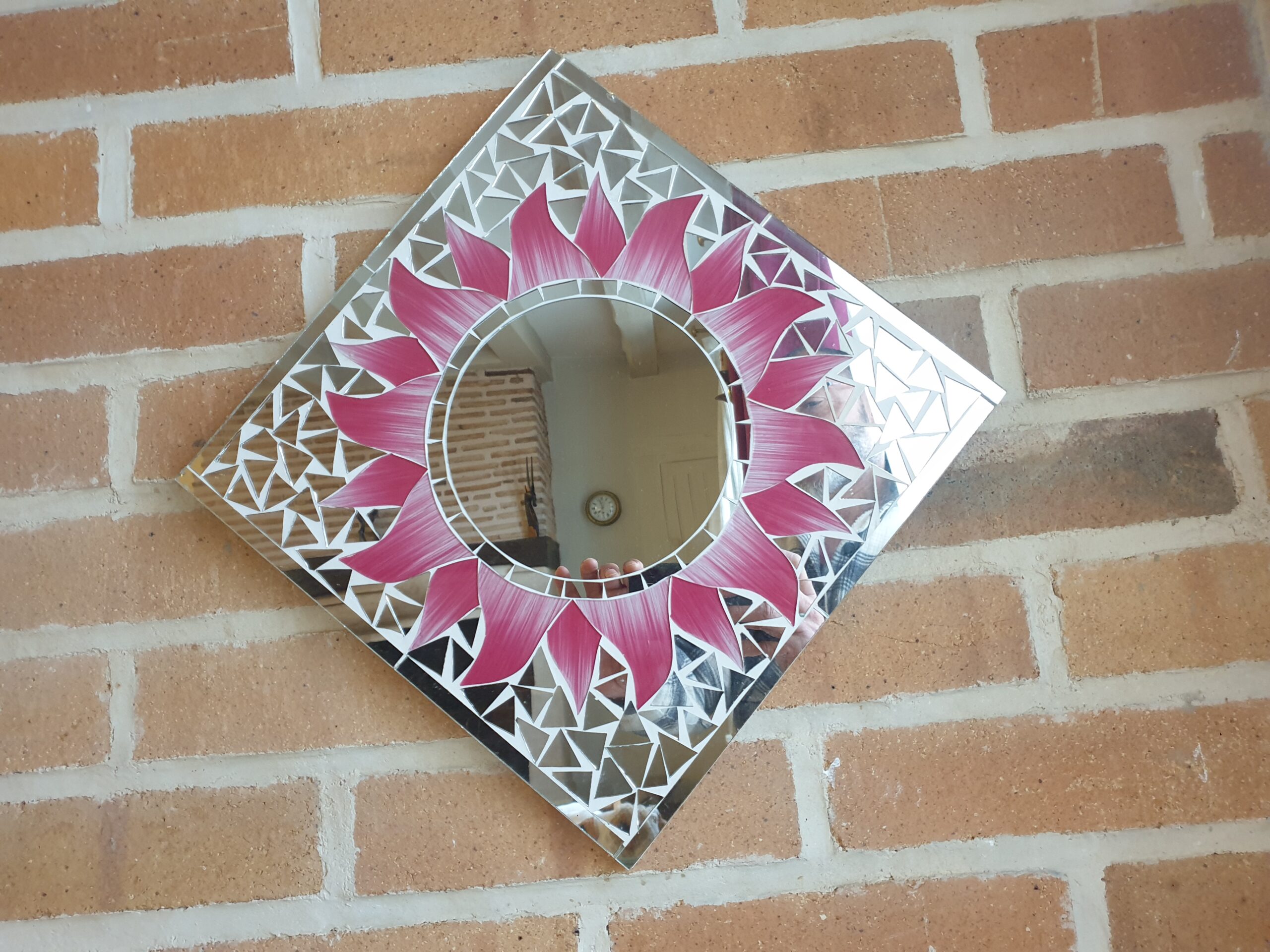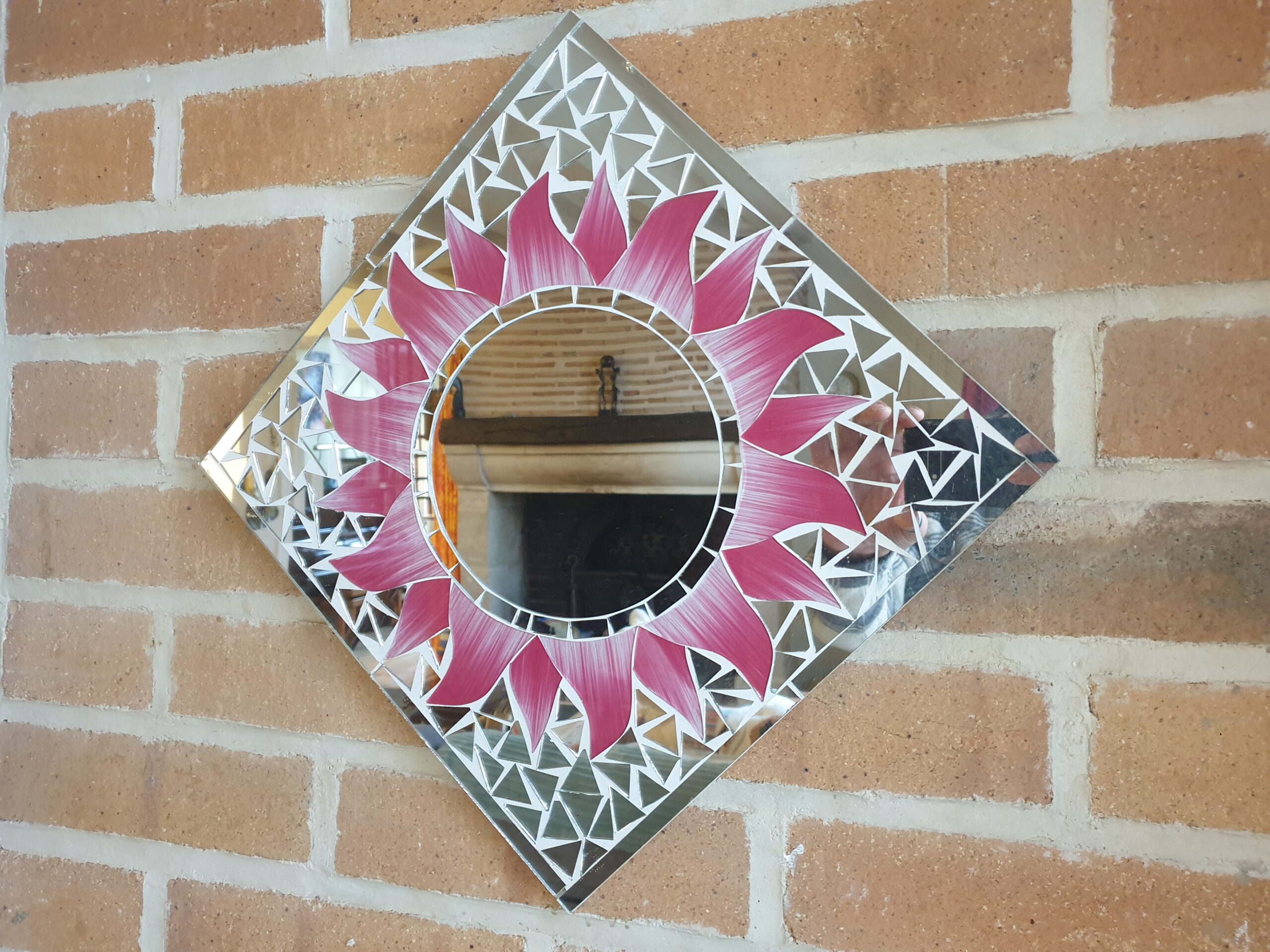 Chaque fragment de mosaïque est soigneusement assemblé pour donner vie à une fleur éclatante. Les nuances de rose des pétales contrastent avec le centre lumineux du miroir, créant un effet visuel harmonieux et captivant.