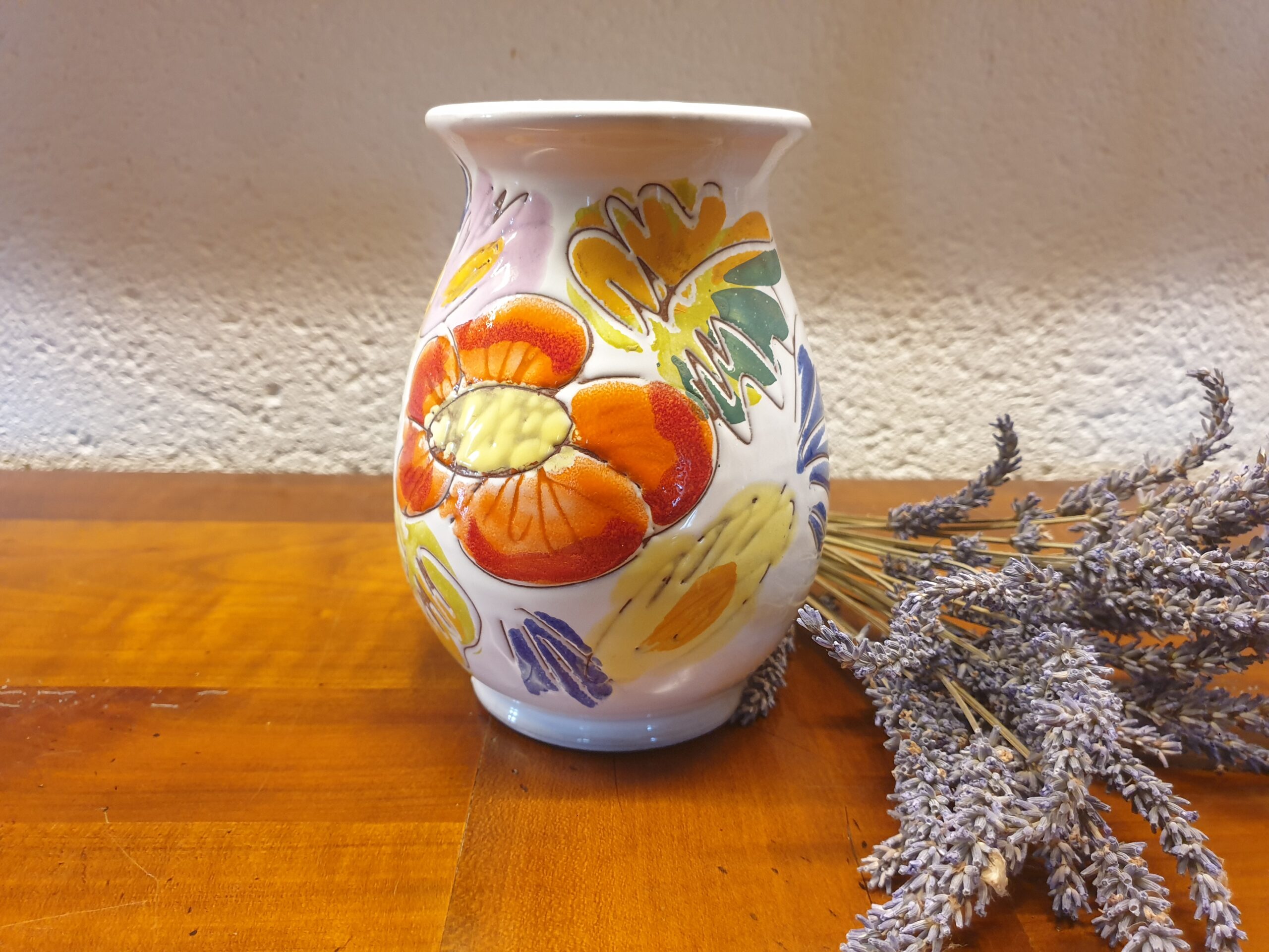Avec ses teintes vives et ses motifs floraux, ce vase apporte une note lumineuse et joyeuse à n’importe quelle pièce, qu’il soit accompagné de fleurs ou utilisé seul.
