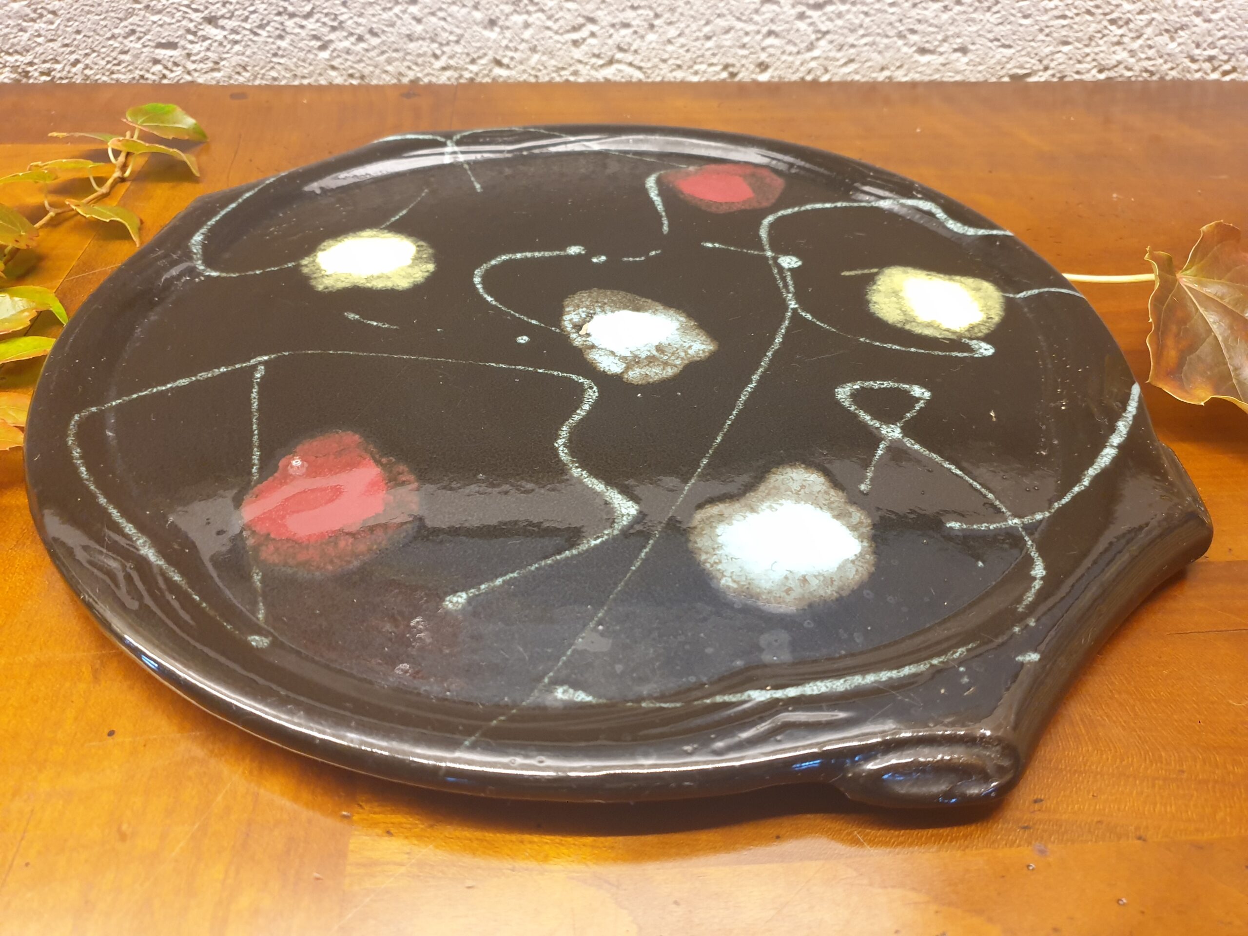 Ce superbe plateau ou plat à tarte céramique noire des années 50 séduit par ses couleurs vives sur fond noir, offrant un contraste audacieux et une allure résolument rétro. Parfait pour servir vos desserts avec style, il apporte une touche de pep’s et d’originalité à votre table. Que ce soit pour présenter une tarte gourmande, des pâtisseries ou même des fruits, ce plat deviendra vite un incontournable de vos repas conviviaux.