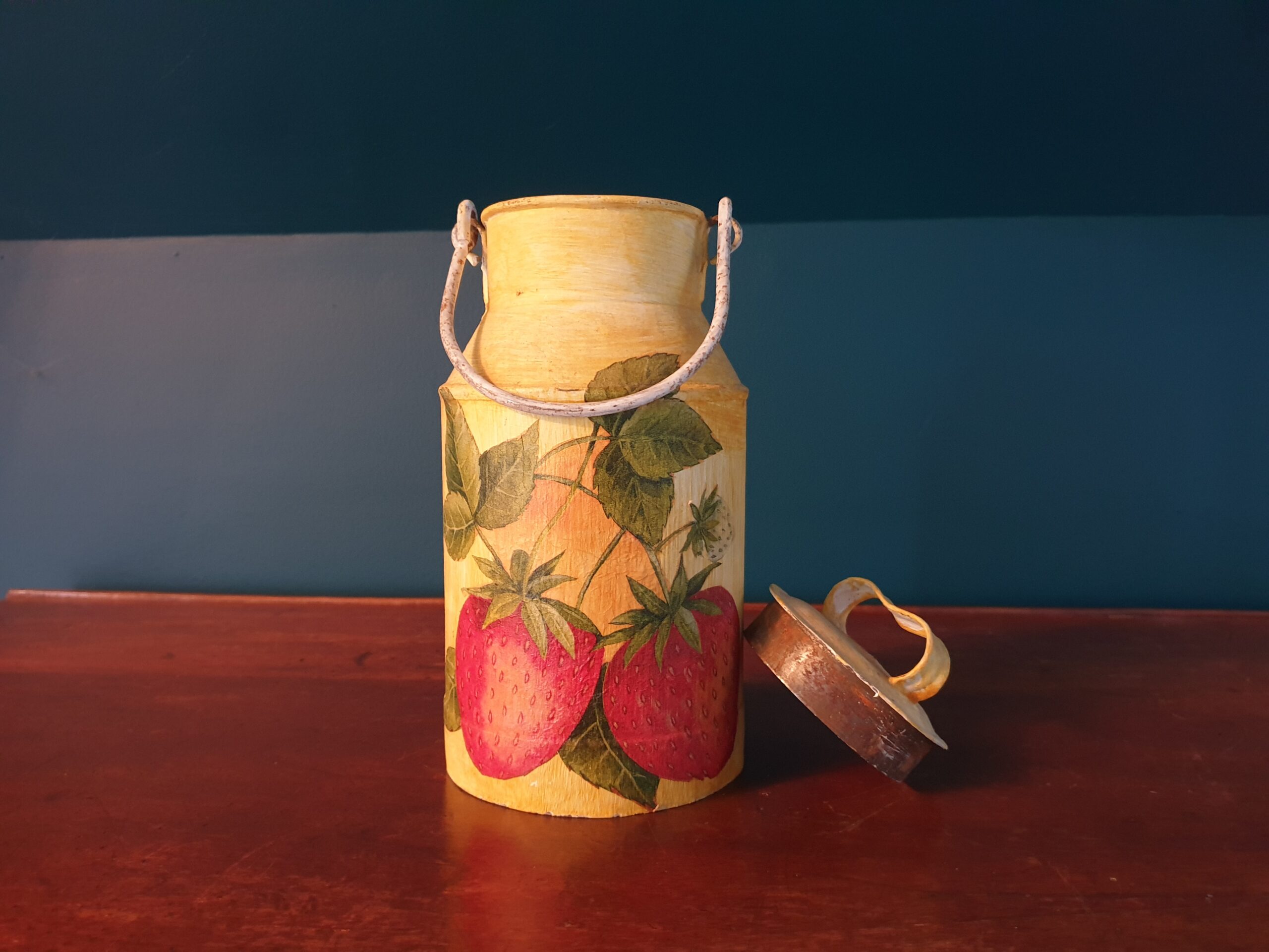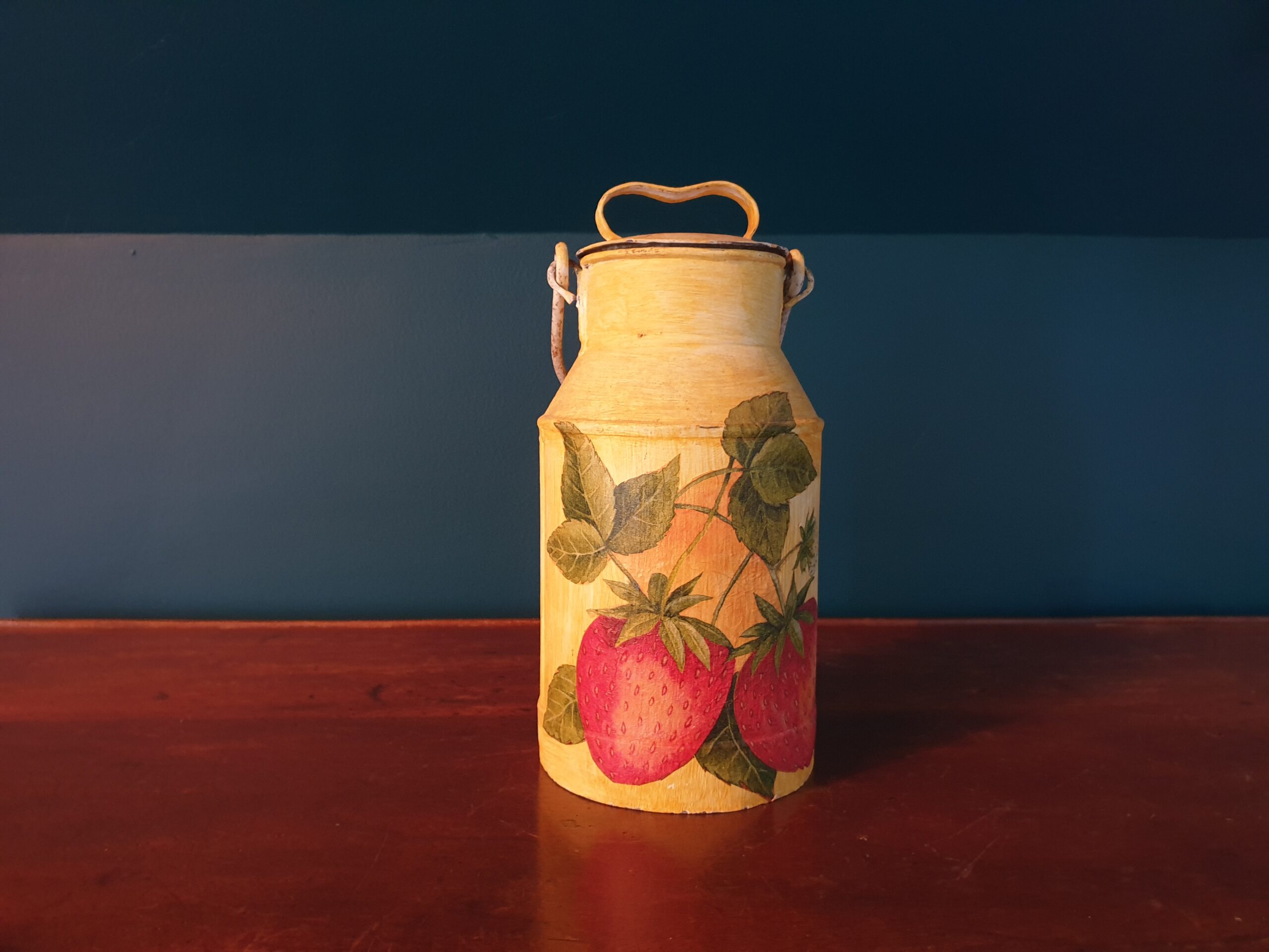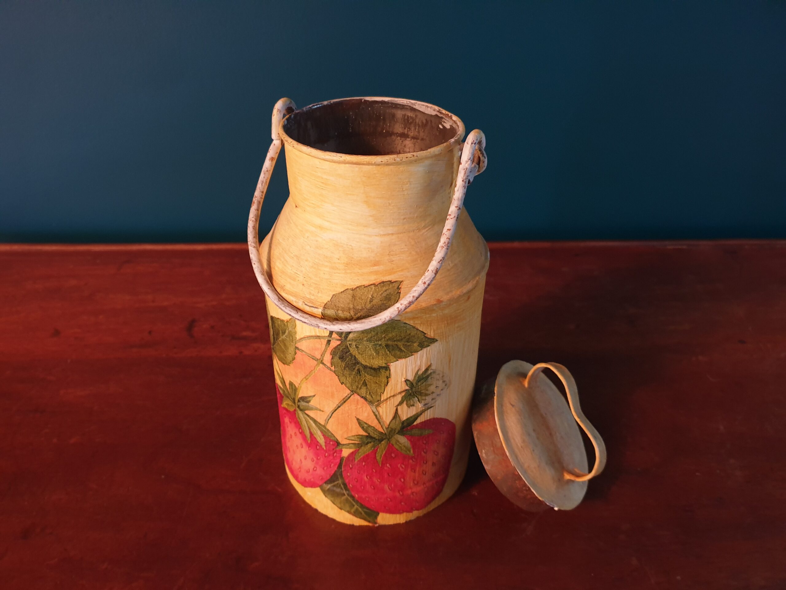 Ce pot au lait vintage, sublimé par un décor de fraises réalisé avec la technique du décopatch, incarne à merveille le mariage entre tradition et créativité. Son allure champêtre et son décor fruité apportent une touche bucolique et nostalgique à votre intérieur. Un véritable coup de cœur pour les amoureux des objets d’autrefois, qui trouvera assurément sa place dans votre cuisine ou votre décoration.
