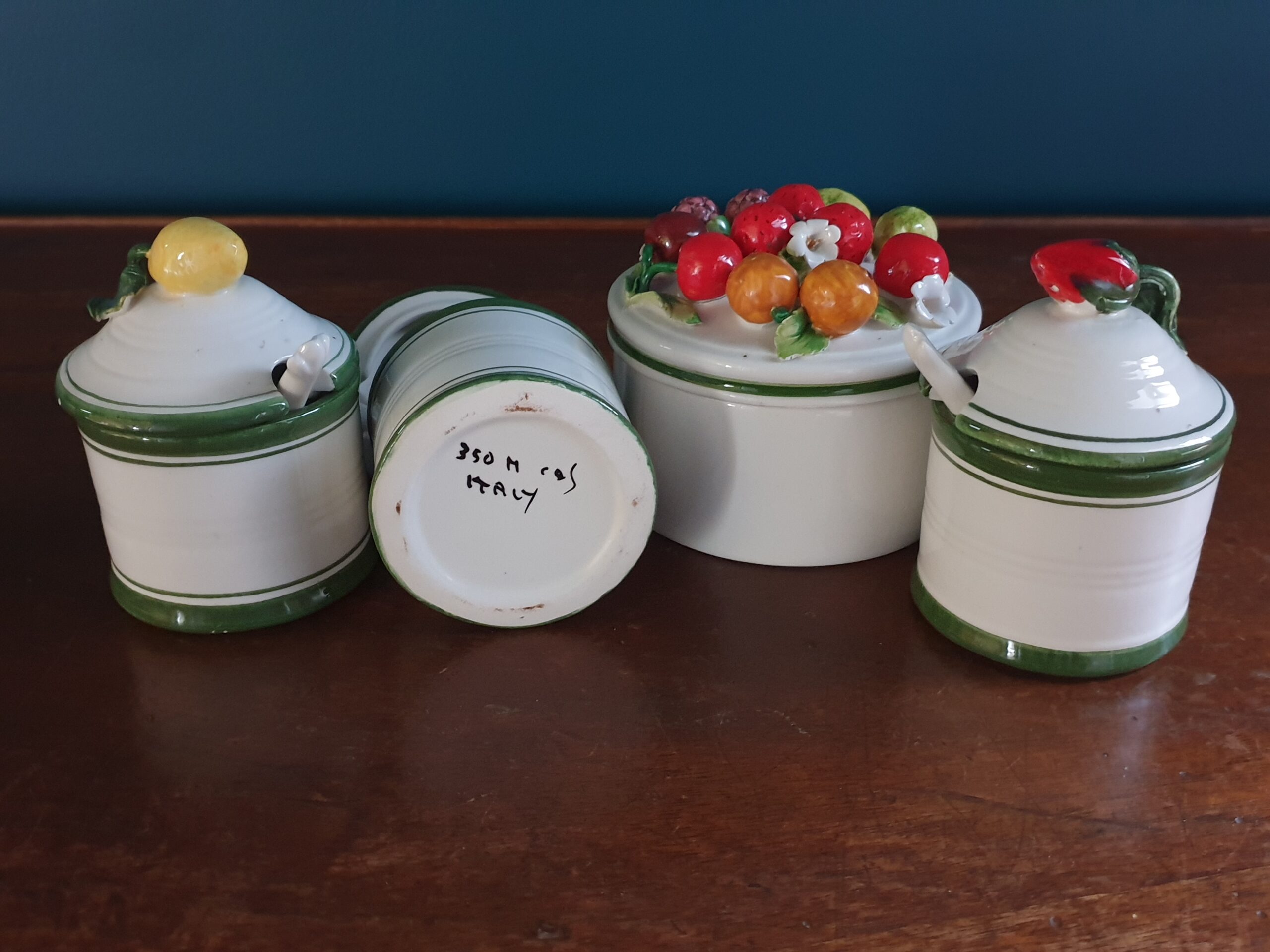 Ce ravissant service à confiture en barbotine italienne séduit par son design coloré et ses motifs fruités. Frais et lumineux, il apporte une touche joyeuse et raffinée à vos petits-déjeuners et pauses gourmandes. Idéal pour les amateurs de vaisselle ancienne et de décoration ensoleillée, il allie esthétique et authenticité.