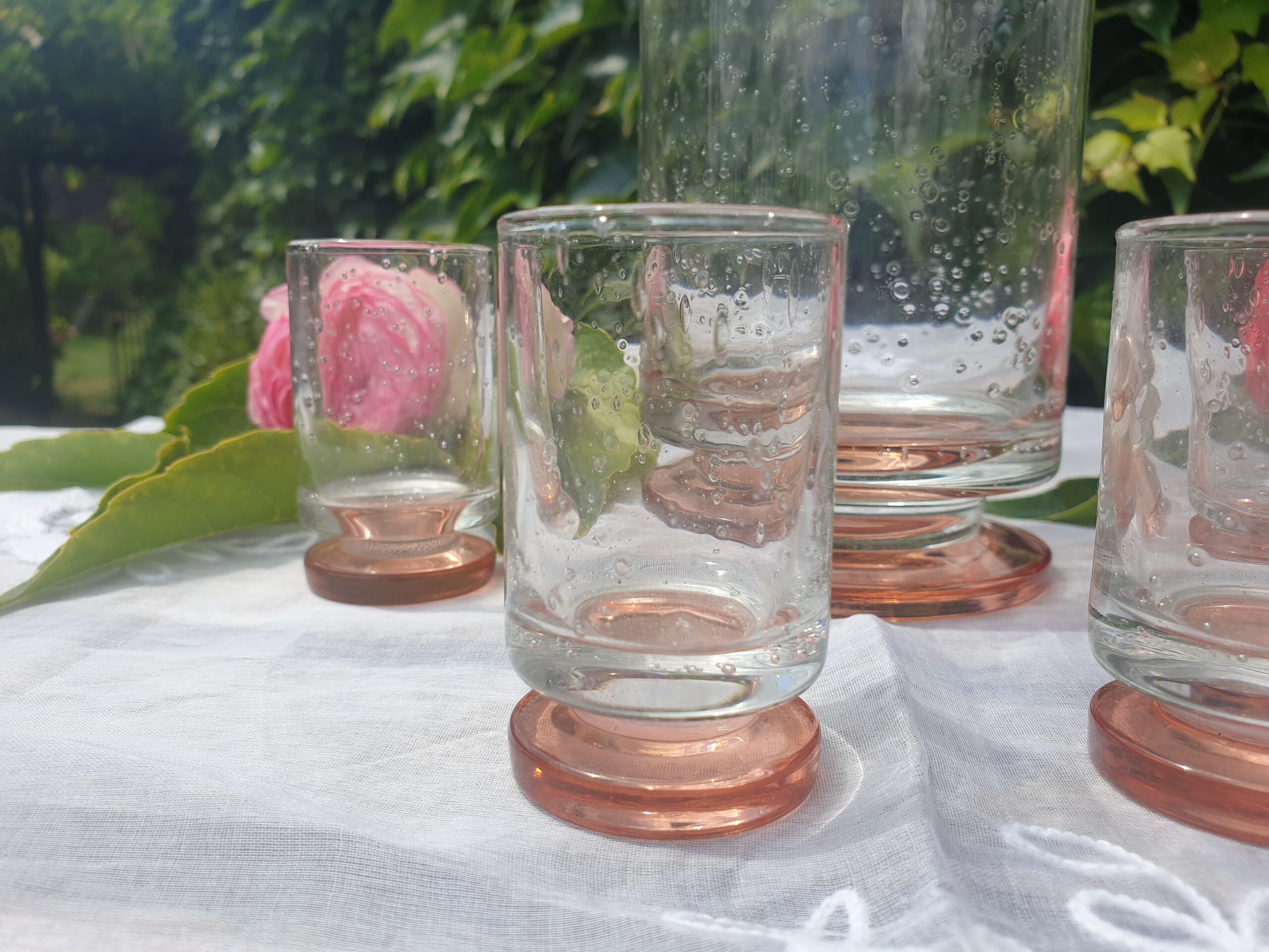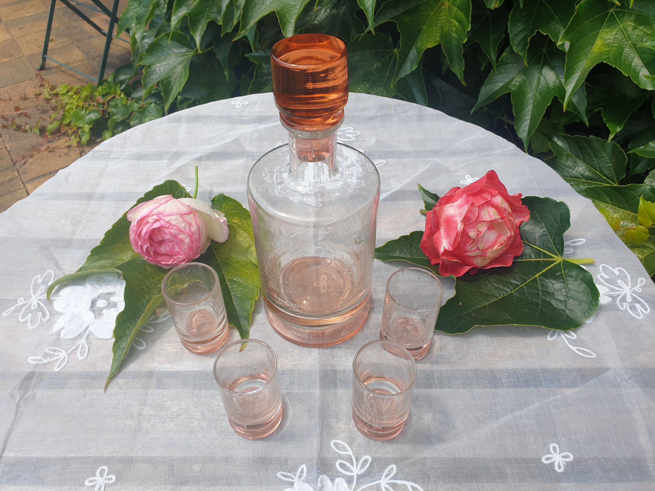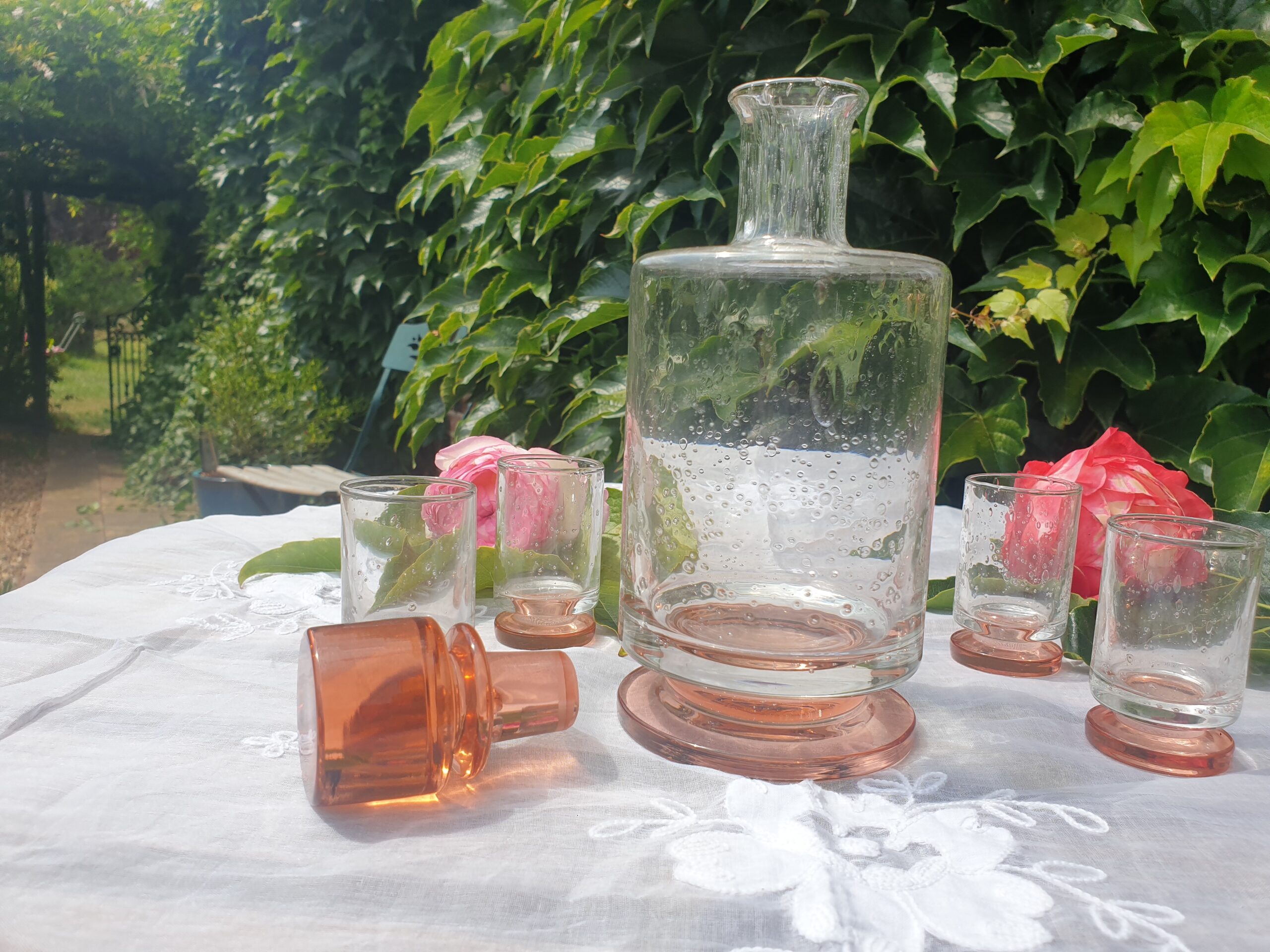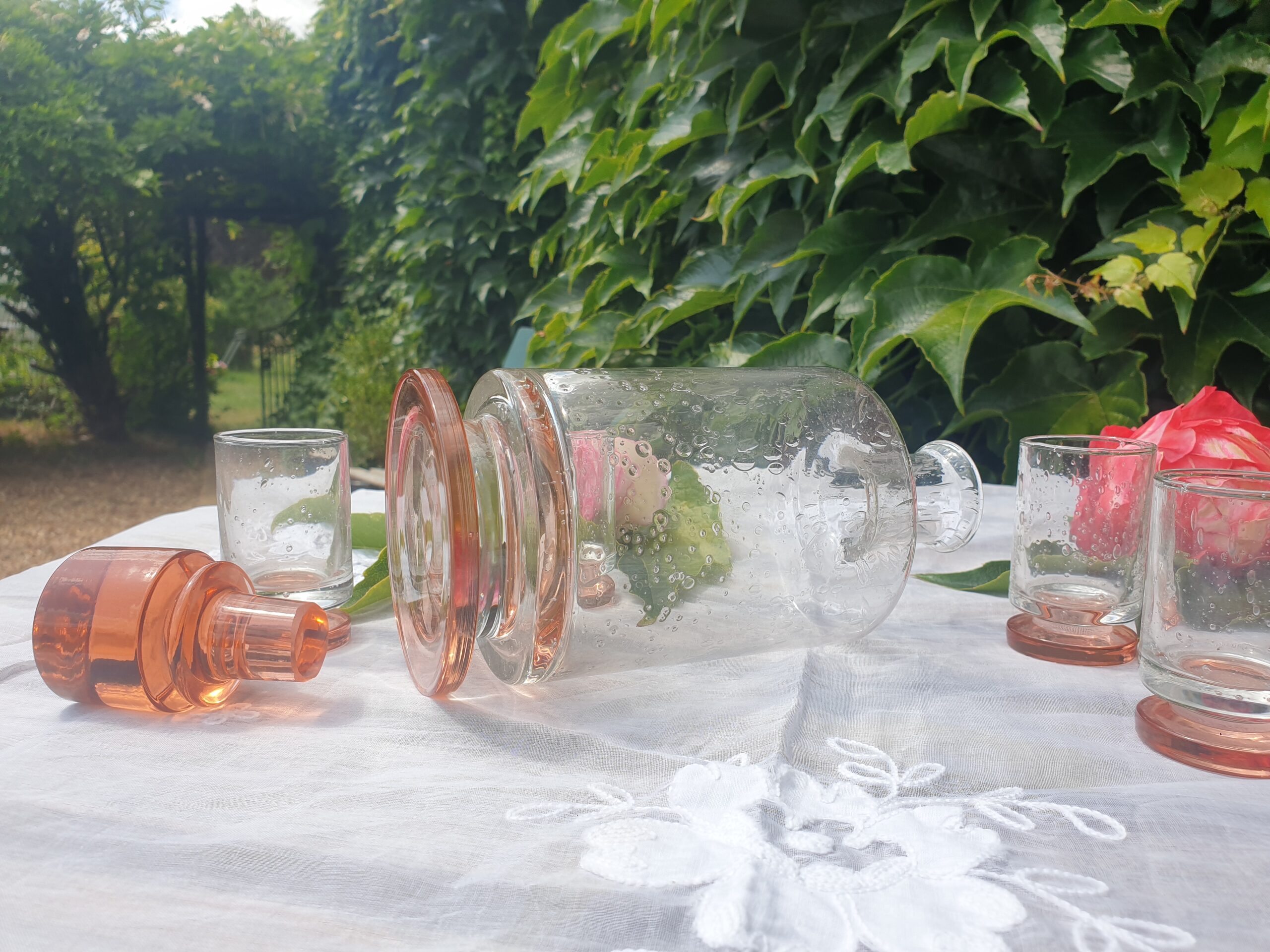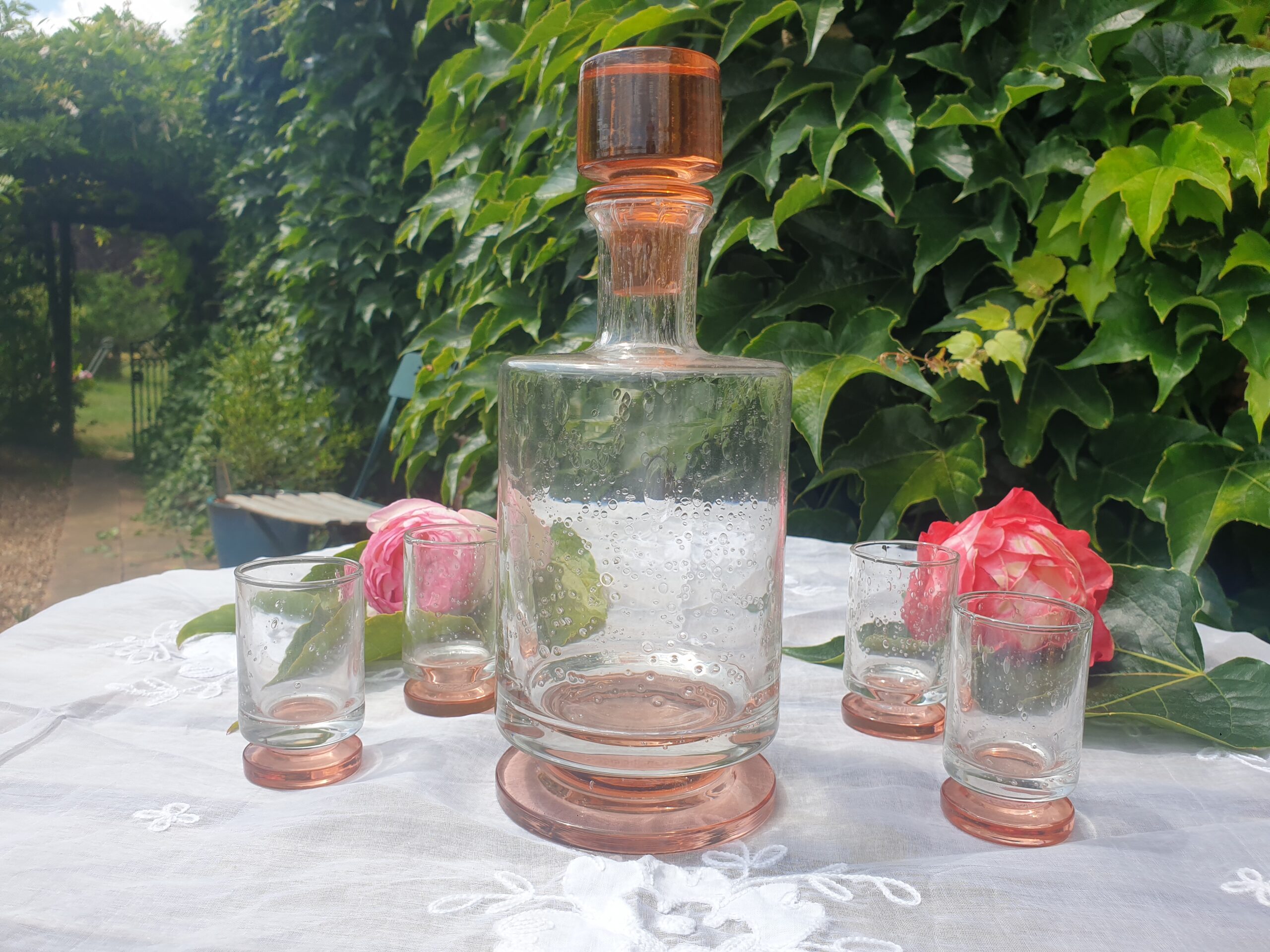 Les usages du service à liqueur Art Déco – Verre bulle rose ambré