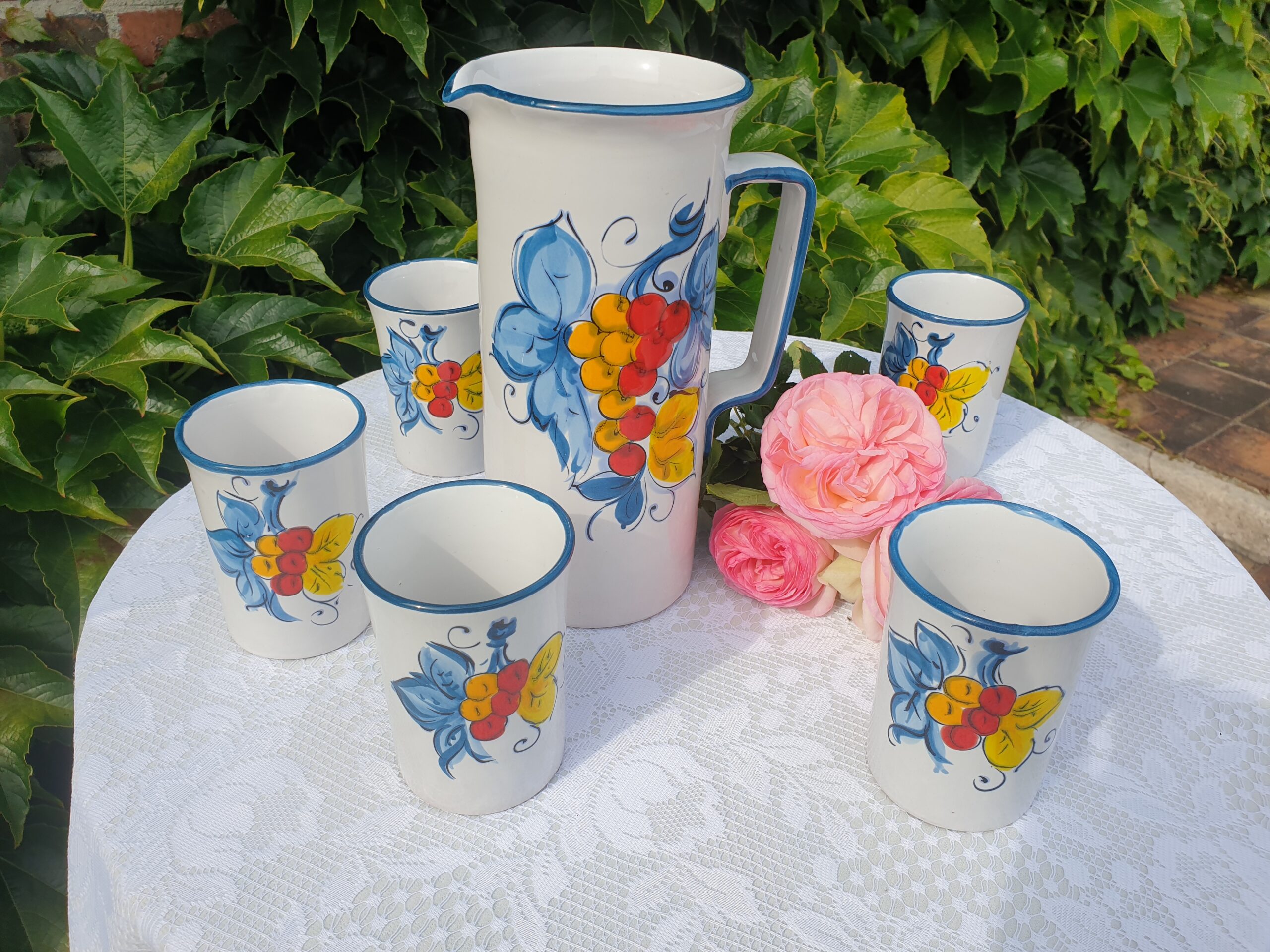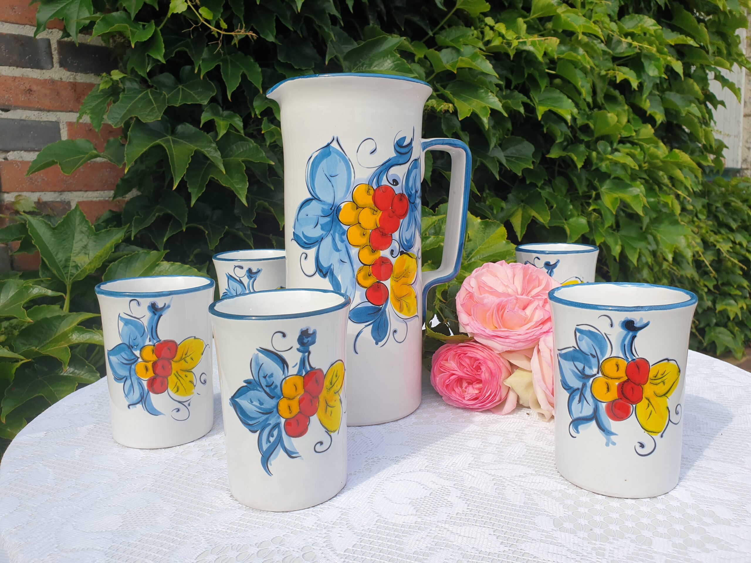 Ce ravissant service à orangeade en porcelaine blanche évoque les goûters d’été et les tablées conviviales. Chaque pièce est décorée de fruits colorés – cerises, abricots, pêches ou raisins – peints avec vivacité dans un esprit joyeux et rétro. Un ensemble plein de fraîcheur, parfait pour recevoir avec gaieté.