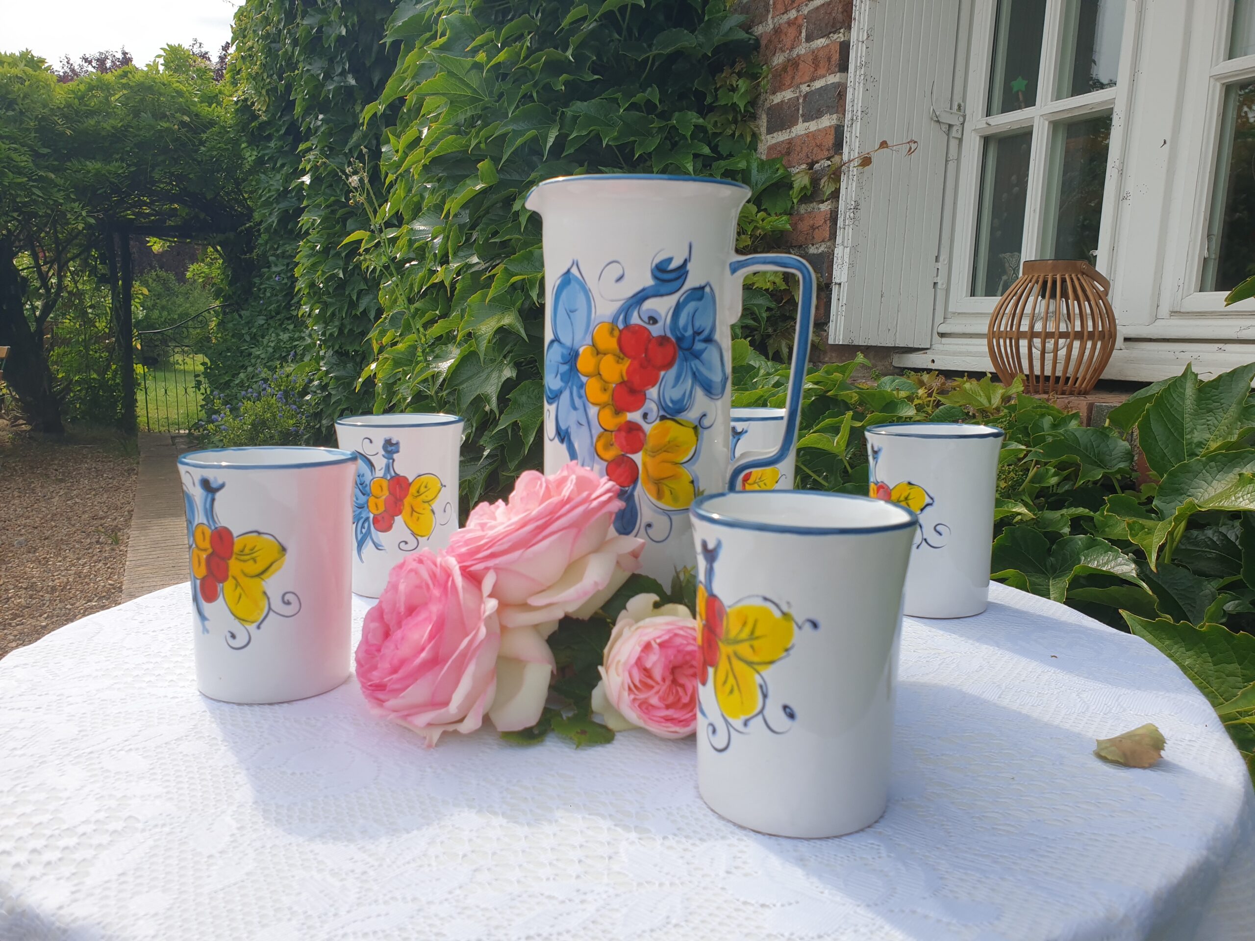 Avec ses motifs colorés et sa silhouette rétro, ce service apporte une touche joyeuse à toute décoration. Il s’accorde parfaitement avec une vaisselle ancienne ou un décor de maison de vacances.
