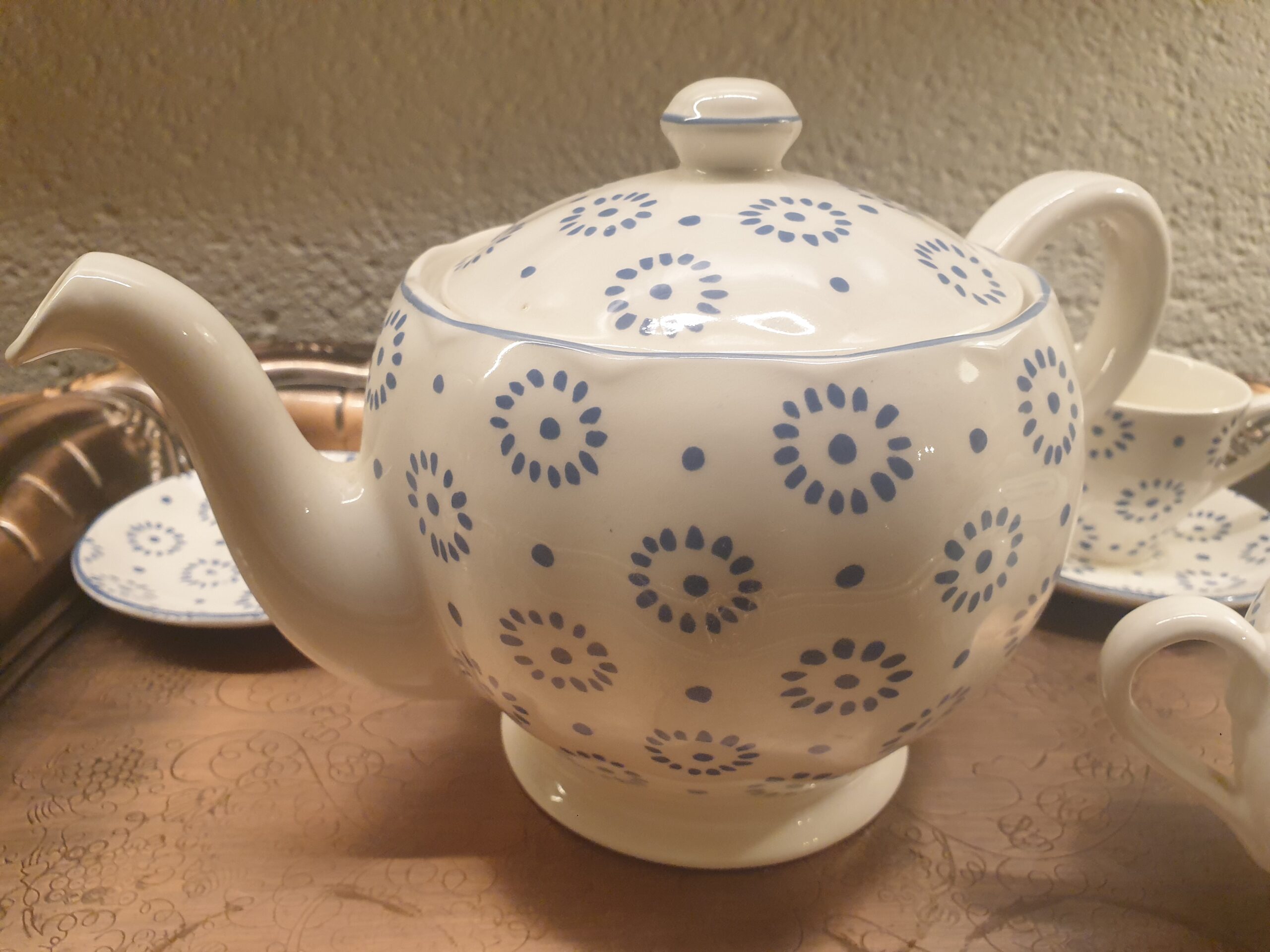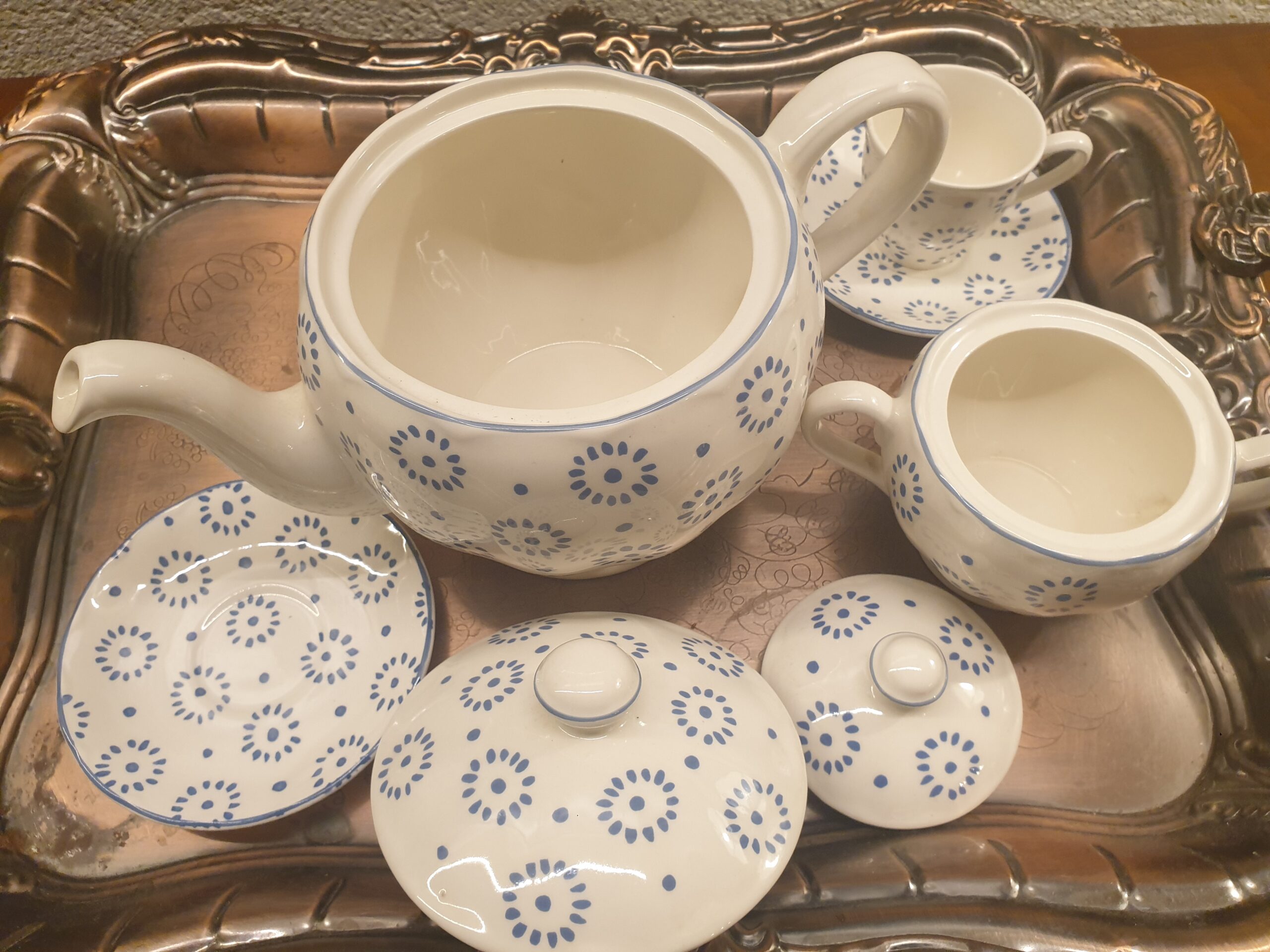 Les petites fleurs bleues, peintes avec minutie, évoquent le charme des jardins anglais. Leur disposition subtile et harmonieuse apporte une note bucolique et romantique à l’ensemble. Ce motif intemporel traverse les époques sans perdre de son élégance, s’adaptant aussi bien à un intérieur classique qu’à une table plus contemporaine.