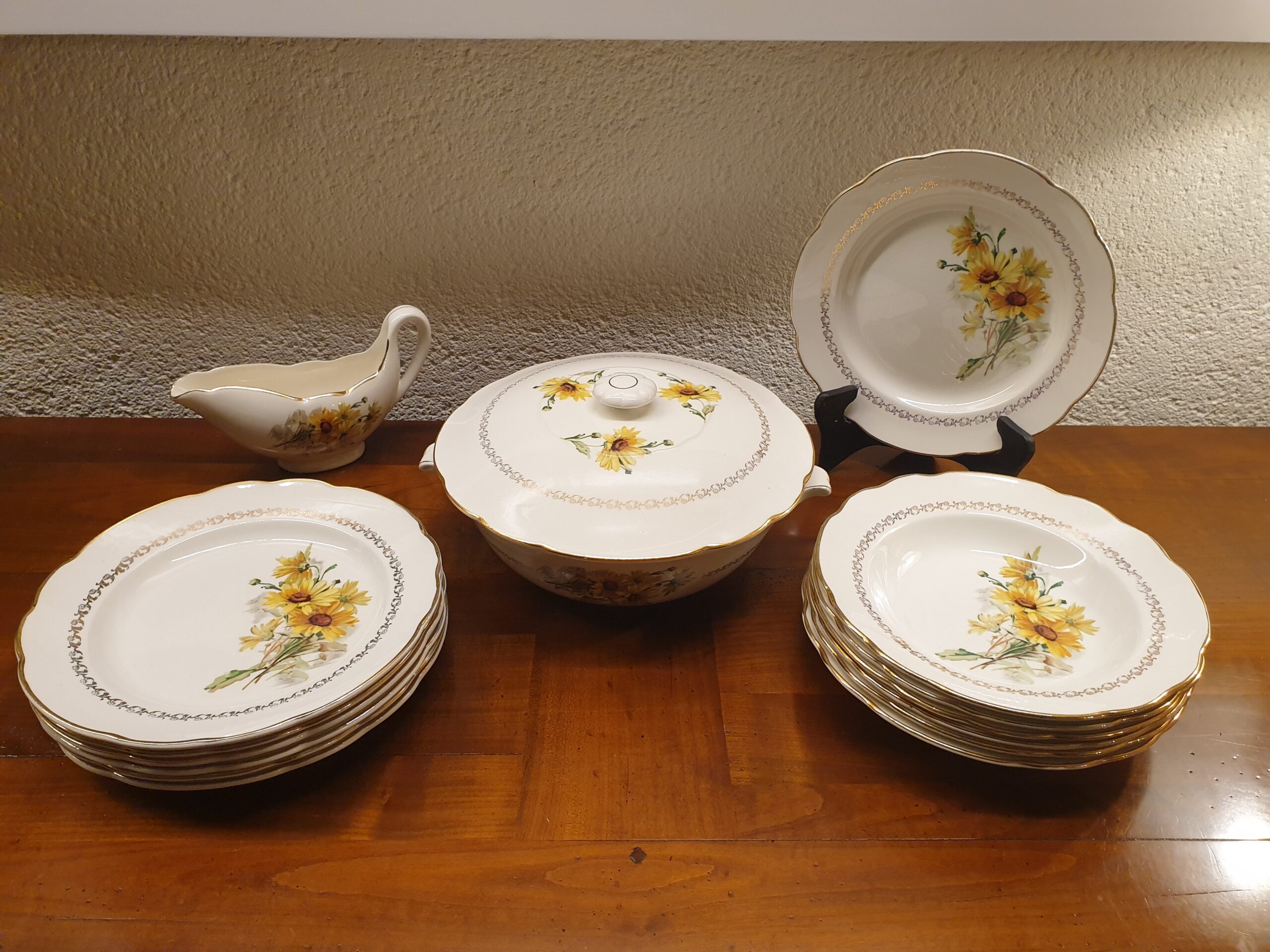 Ce magnifique service GIEN, comprenant 10 assiettes plates, 10 assiettes creuses, 1 saucière et 1 soupière, arbore le célèbre décor aux marguerites. Chaque pièce est en parfait état et prête à sublimer vos repas. Pour vos repas de fête ou vos moments conviviaux, ce service apportera à vos tables une touche de beauté et de raffinement qui impressionnera vos invités.