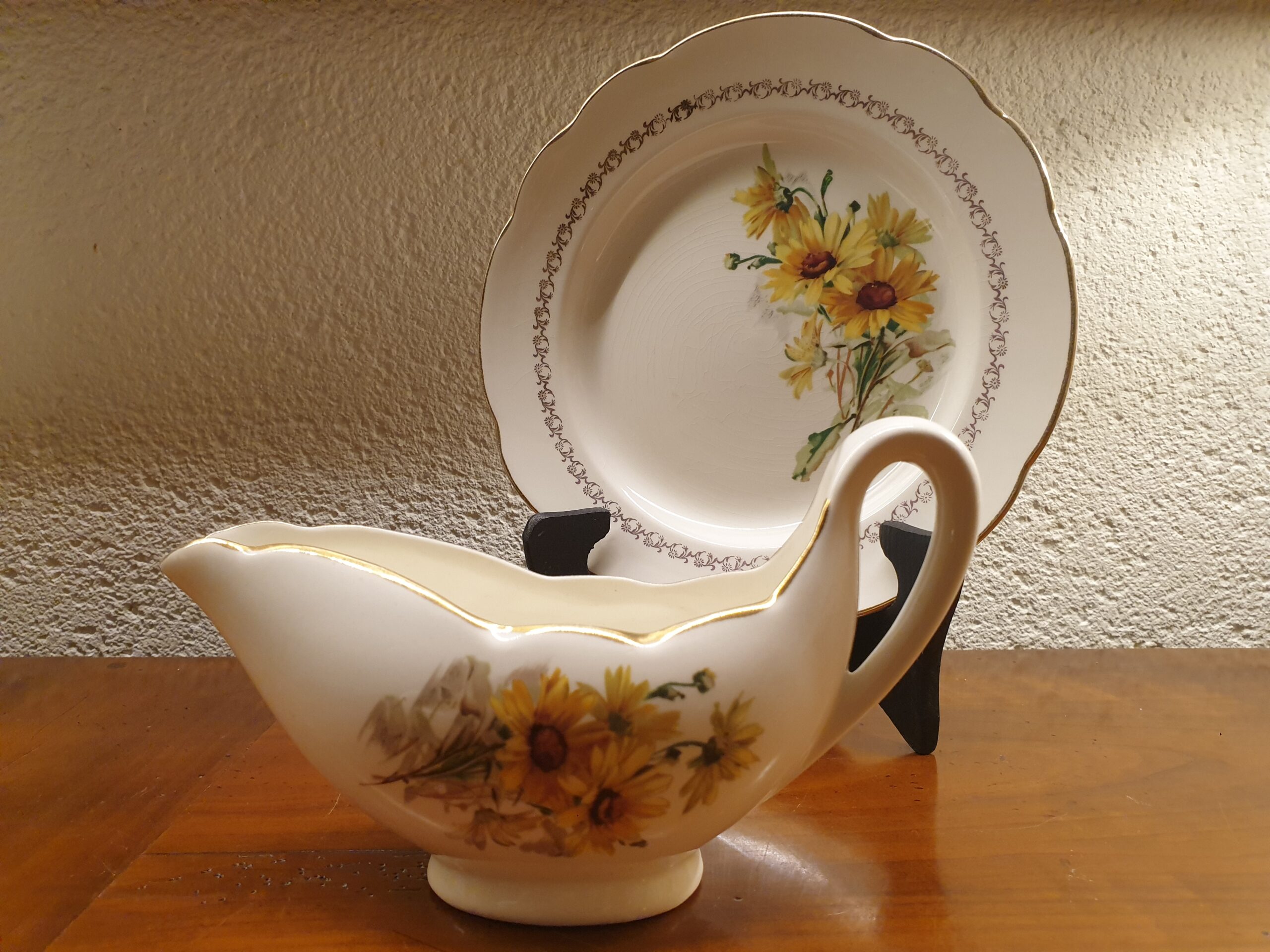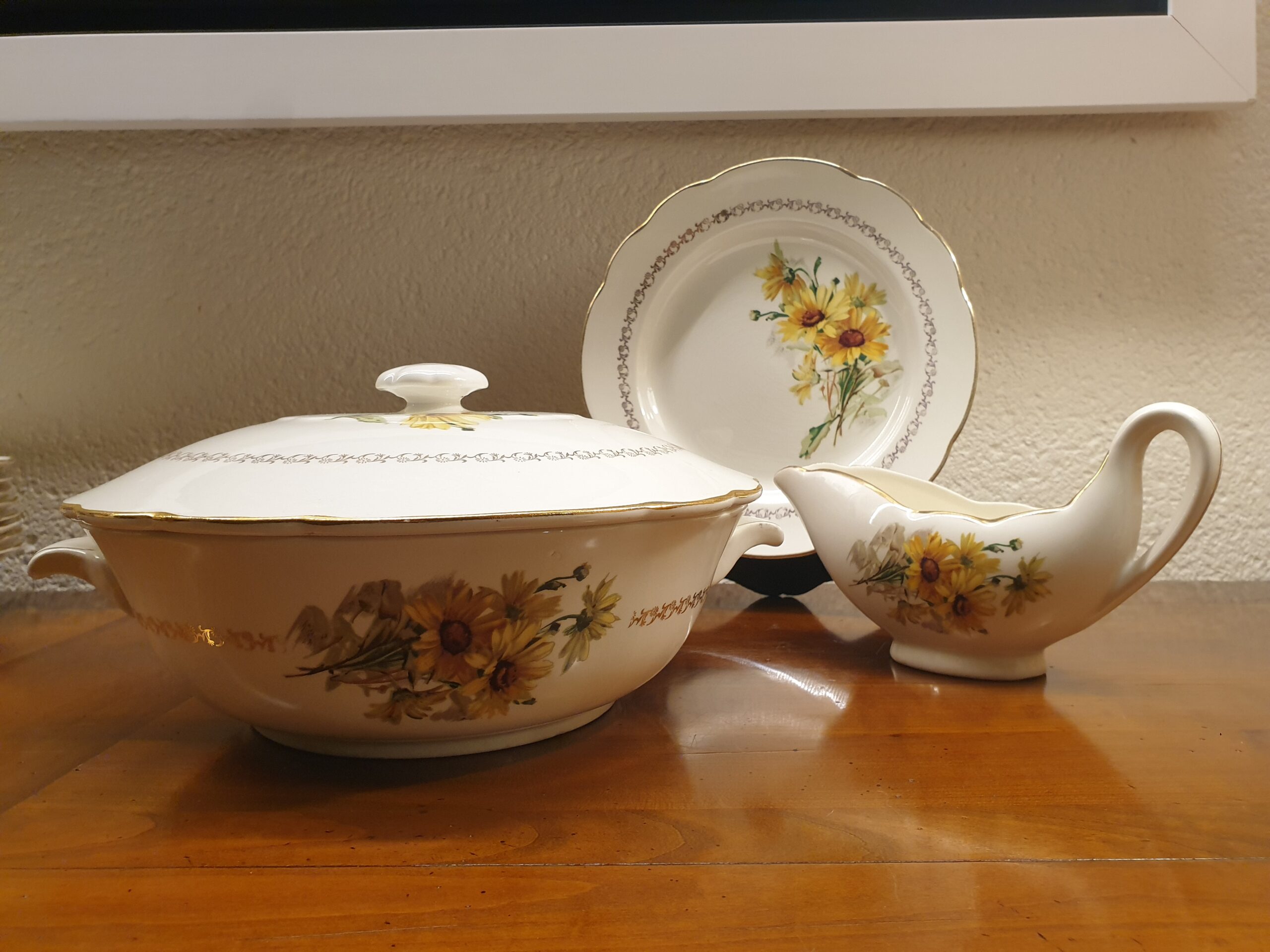 Dimensions : assiette : diamètre : 24 cm, soupière : diamètre : 26 cm, hauteur : 9 cm, saucière longueur 20cm, largeur : 10 cm