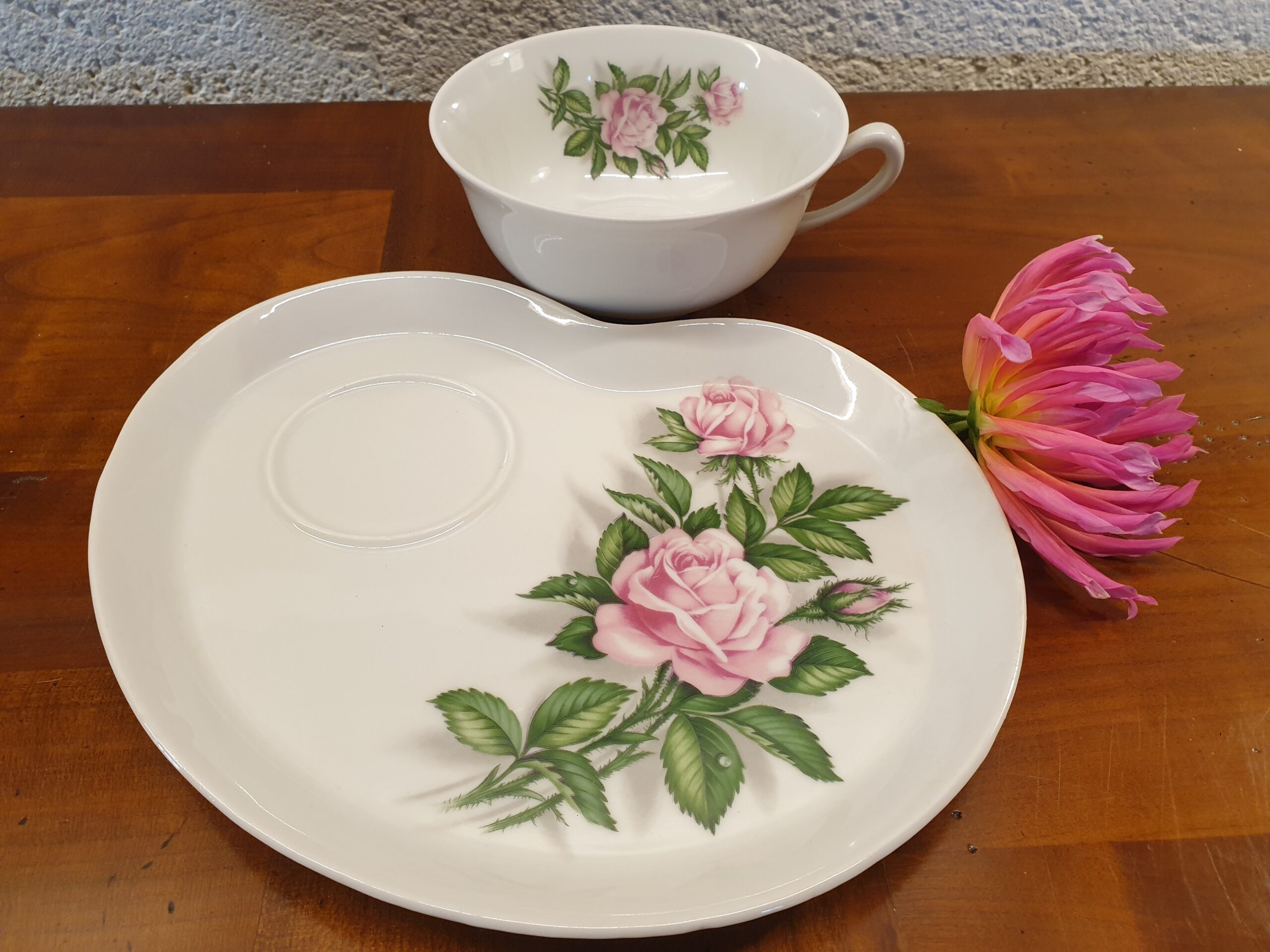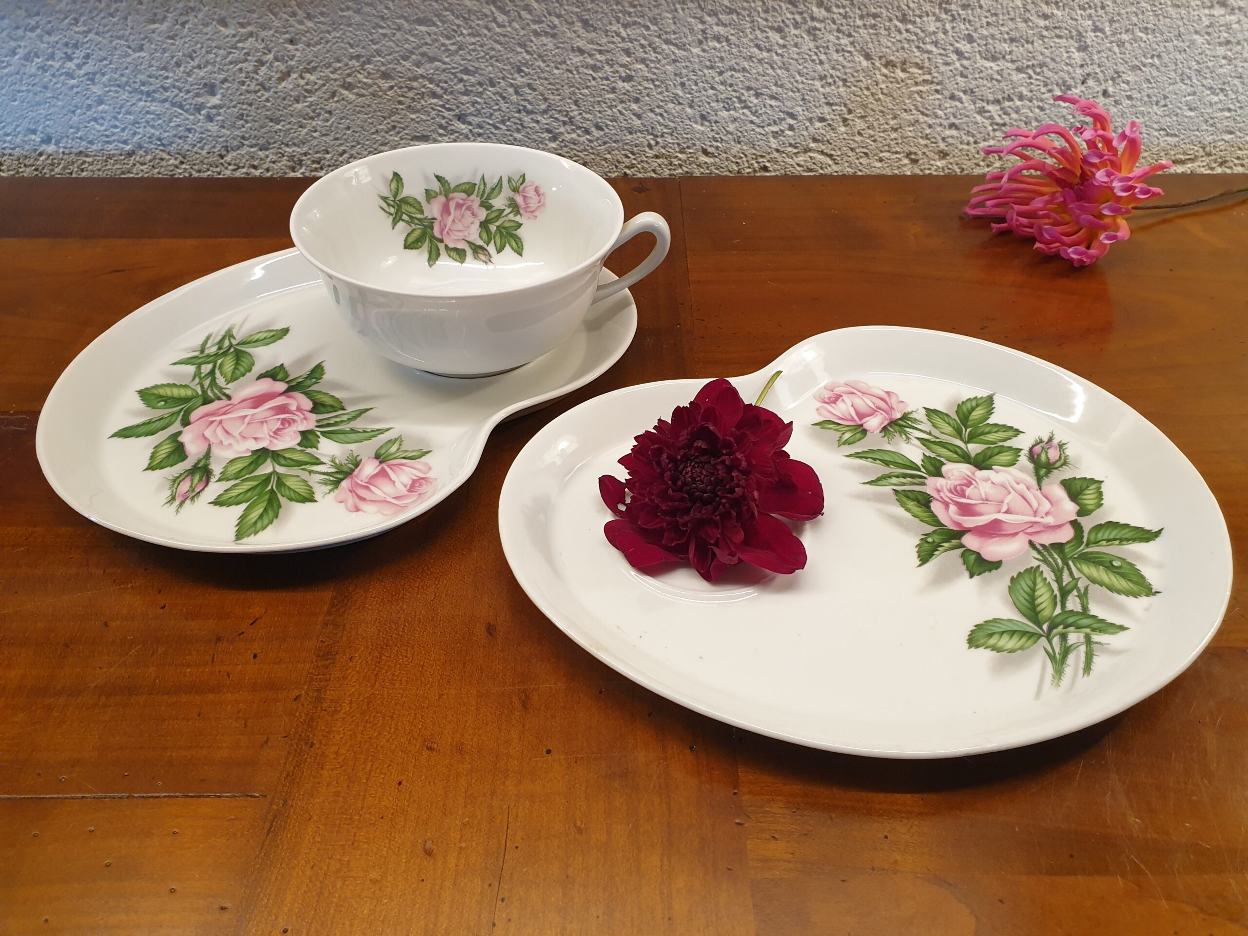 Les roses délicatement peintes, accompagnées de leur feuillage vert, créent un contraste harmonieux tout en douceur. Un décor intemporel qui évoque le raffinement des tables d’antan.