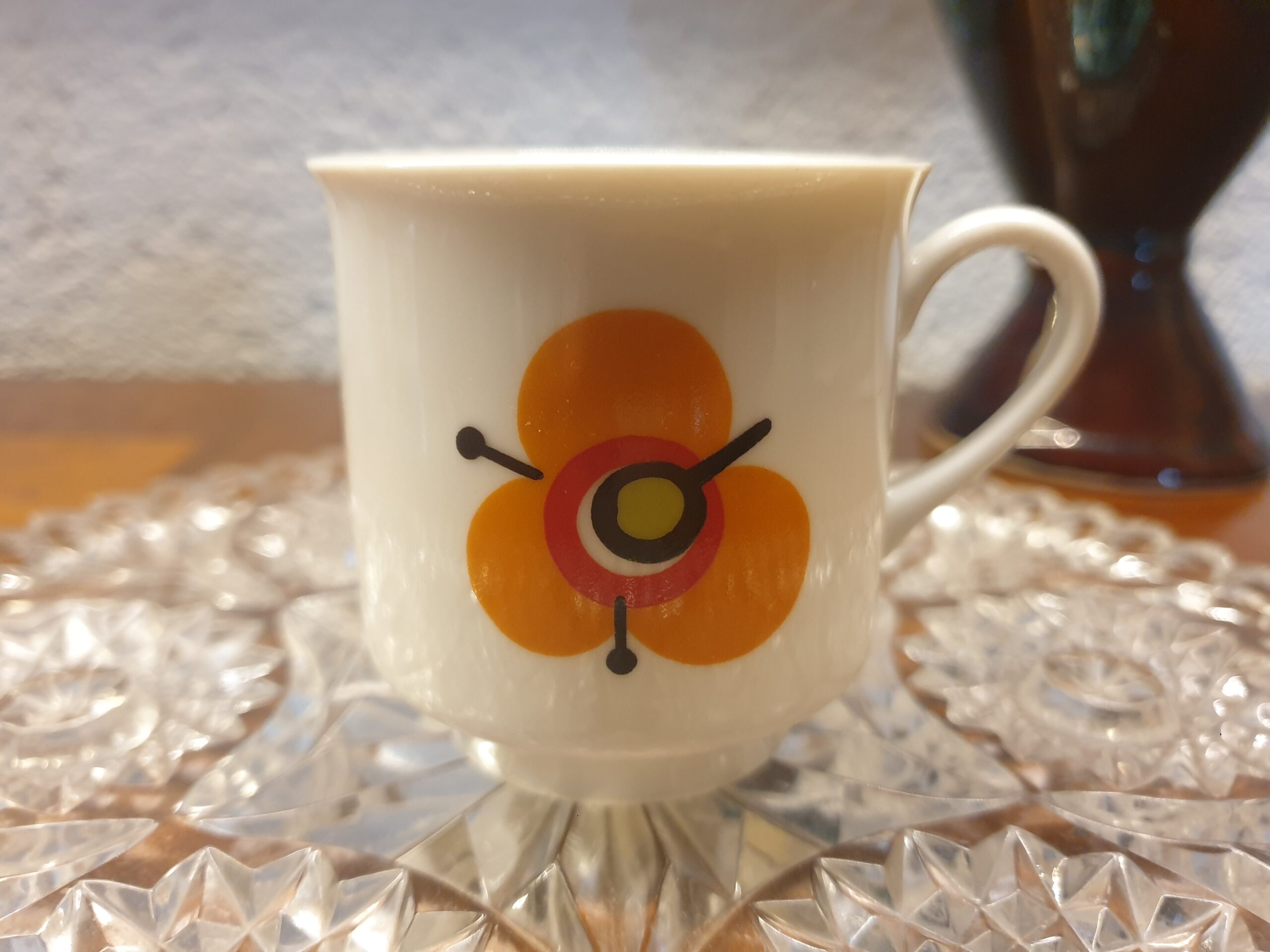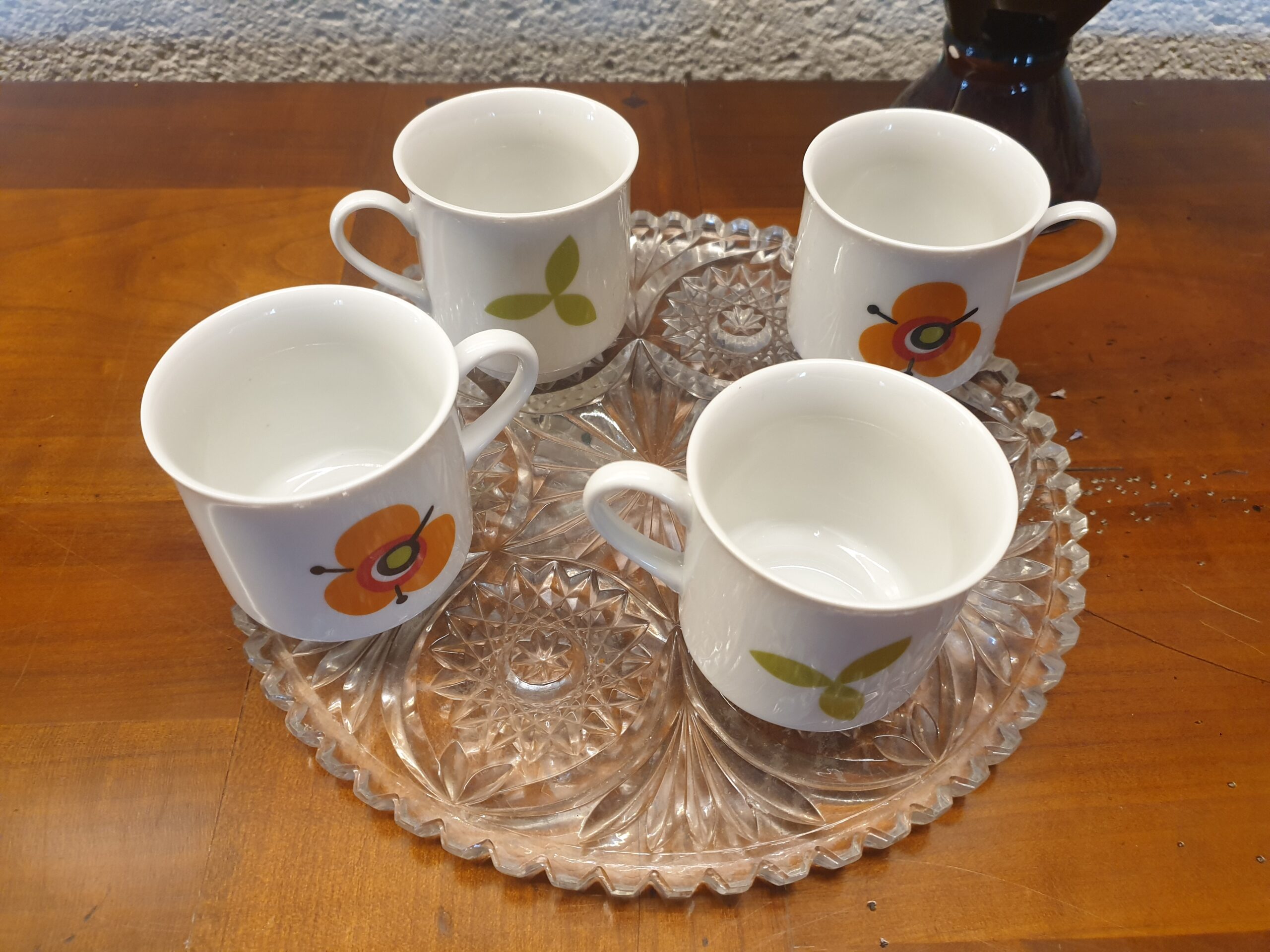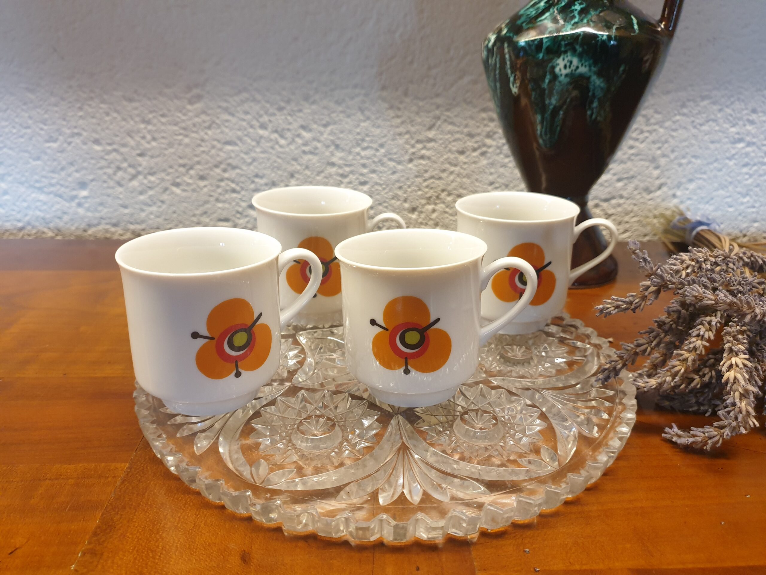 Les tasses vintage en porcelaine séduisent par leur délicatesse et leur charme d’antan. Décorées d’une fleur orange lumineuse sur la face et d’un petit trèfle au dos, elles rappellent la douceur des goûters d’autrefois. Idéales pour les amateurs de vaisselle rétro et d’objets empreints de poésie, elles apportent une note élégante et chaleureuse à chaque dégustation.