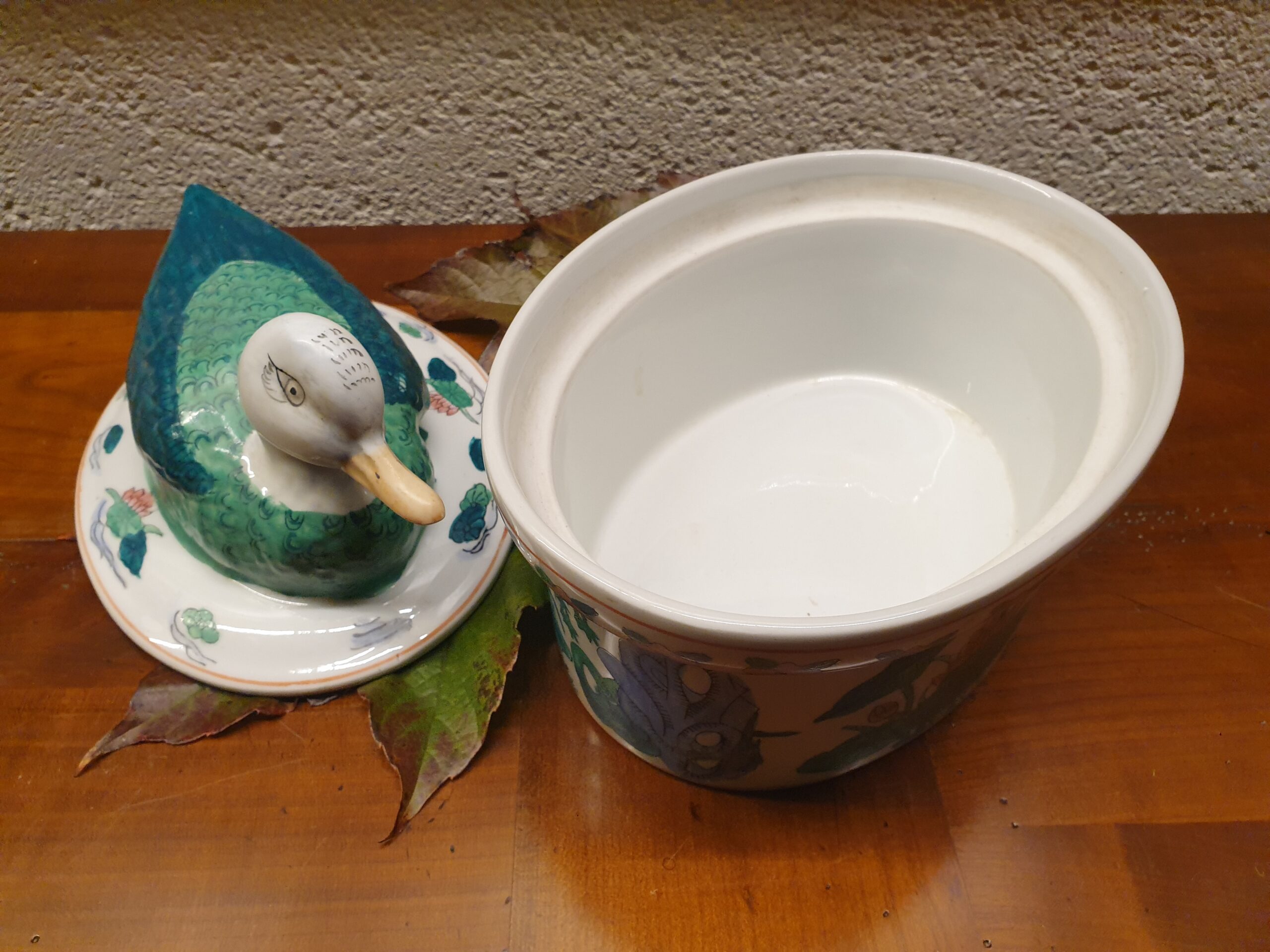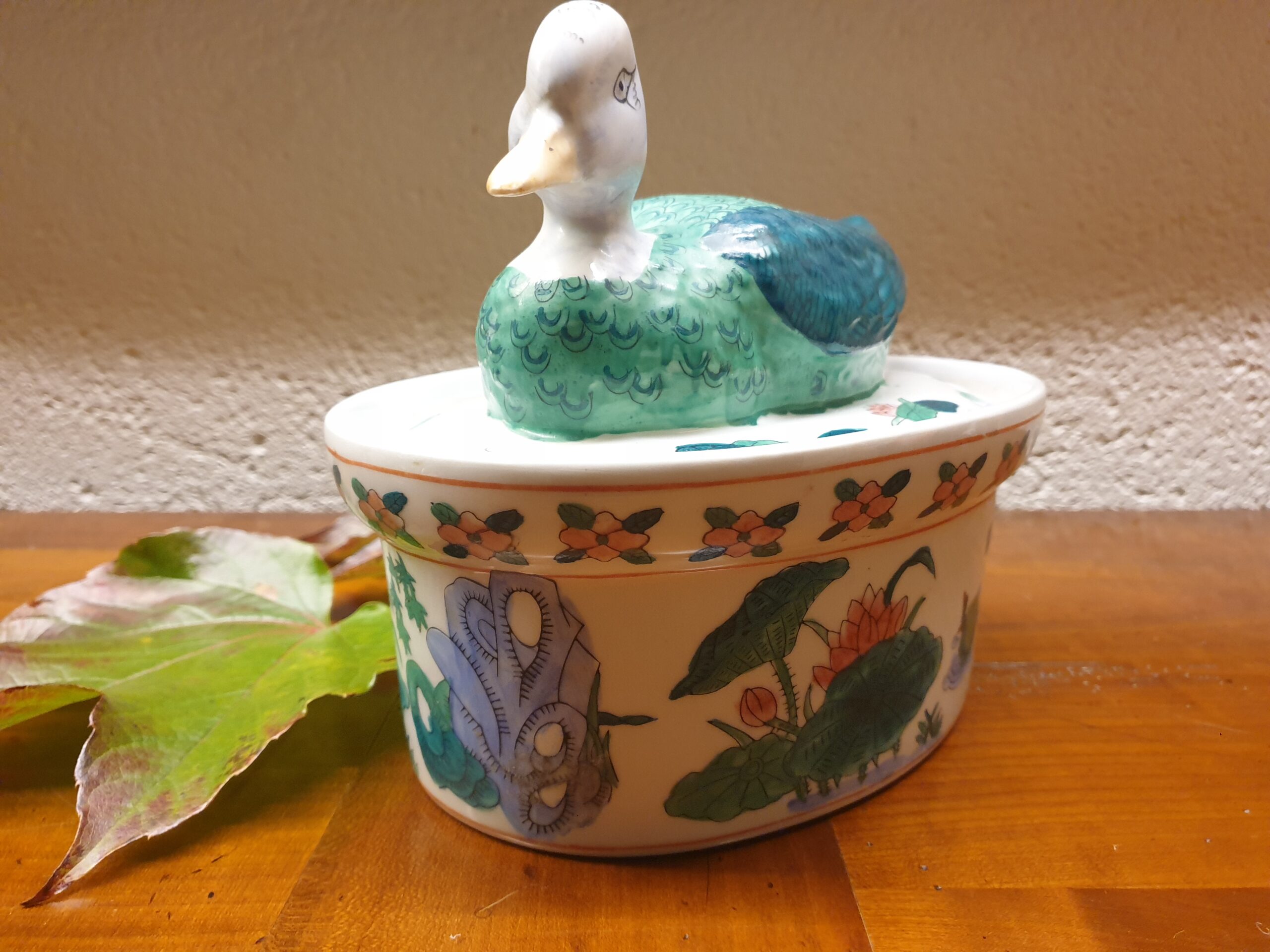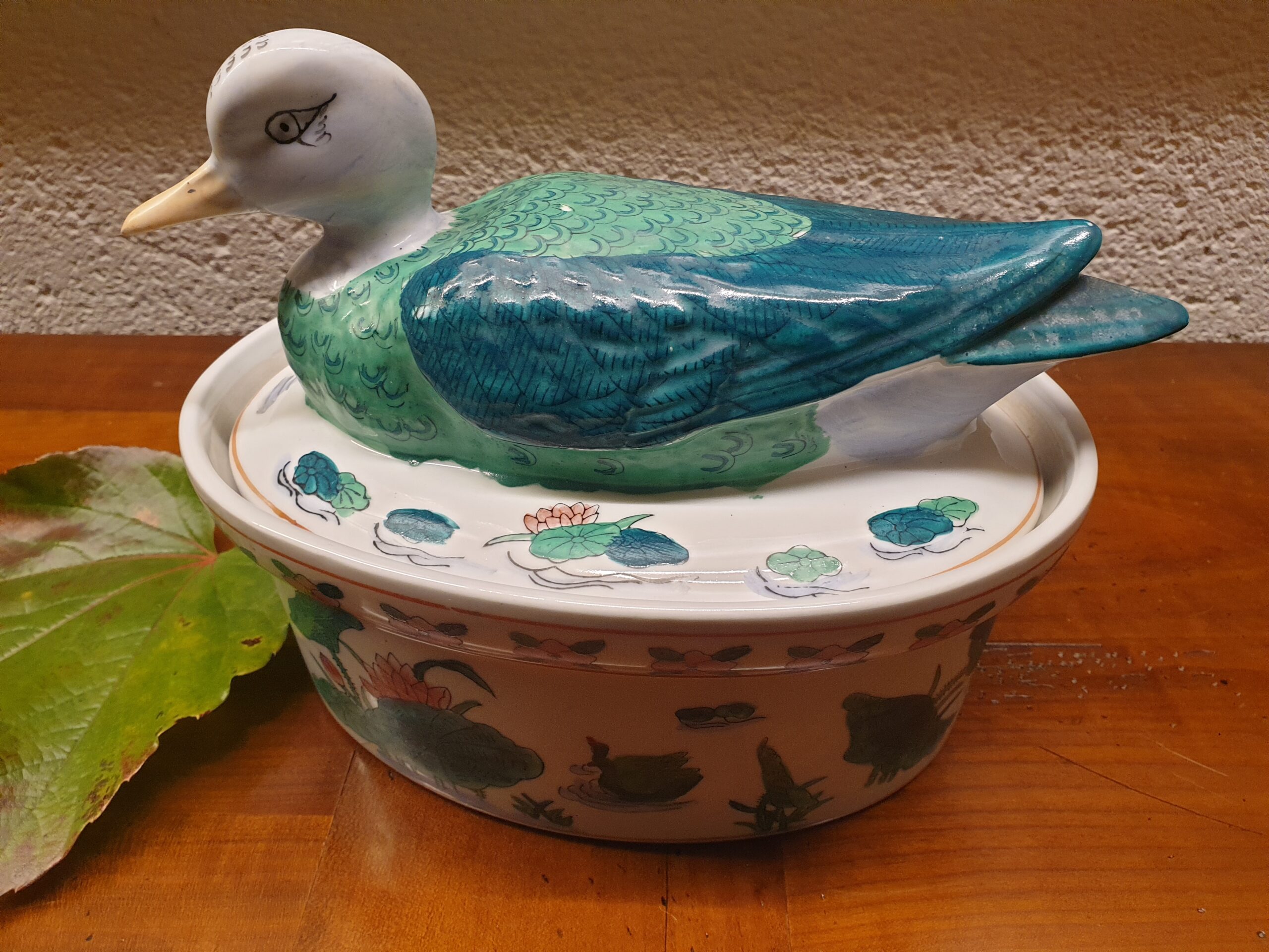Les motifs de cette terrine, influencés par l’Art asiatique, présentent des éléments tels que des canards, des fleurs de lotus et des scènes lacustres. Ces décorations subliment la forme de la terrine et lui confèrent une esthétique élégante et exotique.