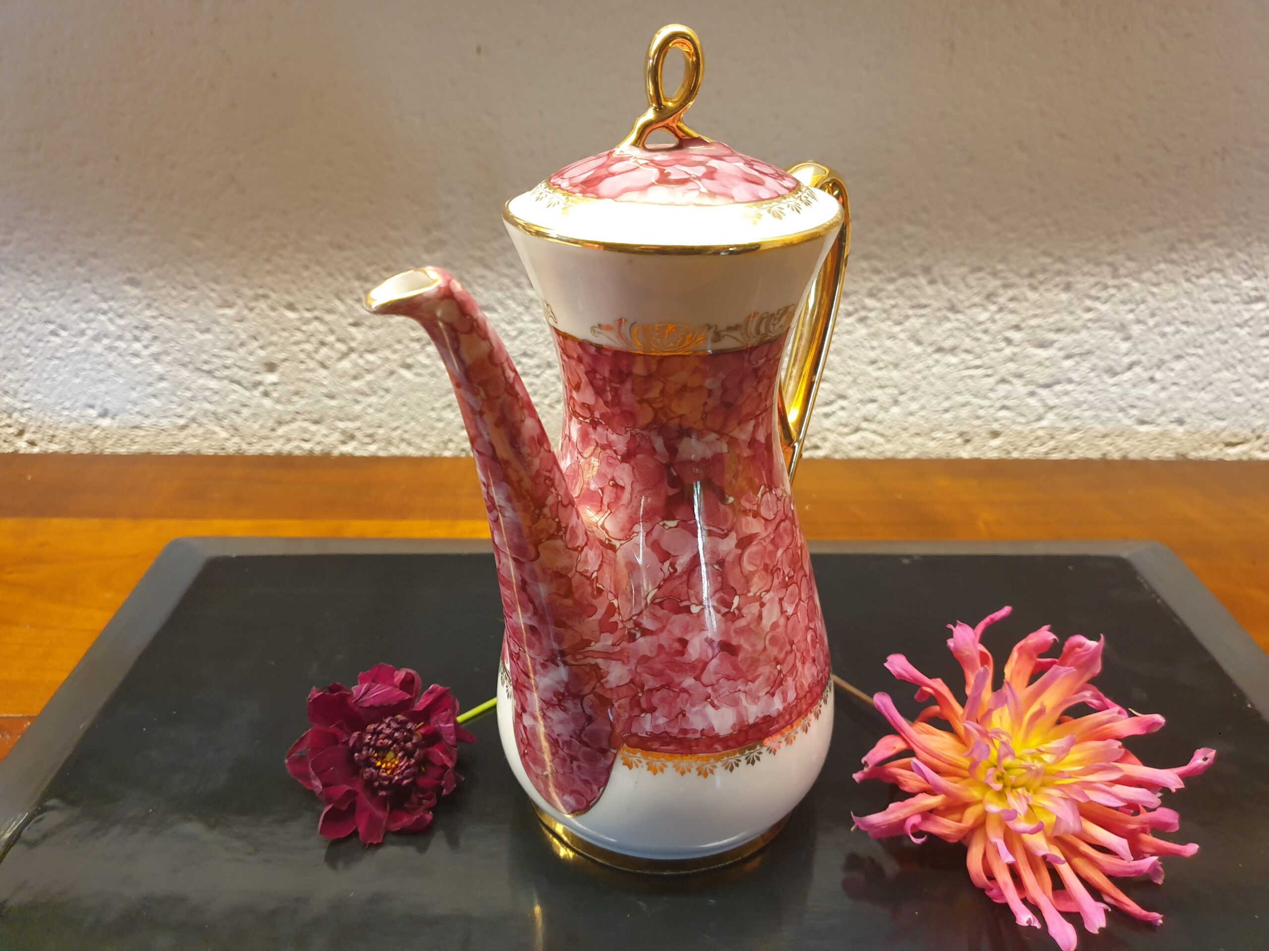 Son élégante teinte rose foncé sublime un motif de pétales délicatement disposés sur sa surface. Les artisans ont réhaussé l’anse et les bords d’or fin, ajoutant une touche de prestige et de sophistication.Ce décor soigné en fait une pièce unique et précieuse.