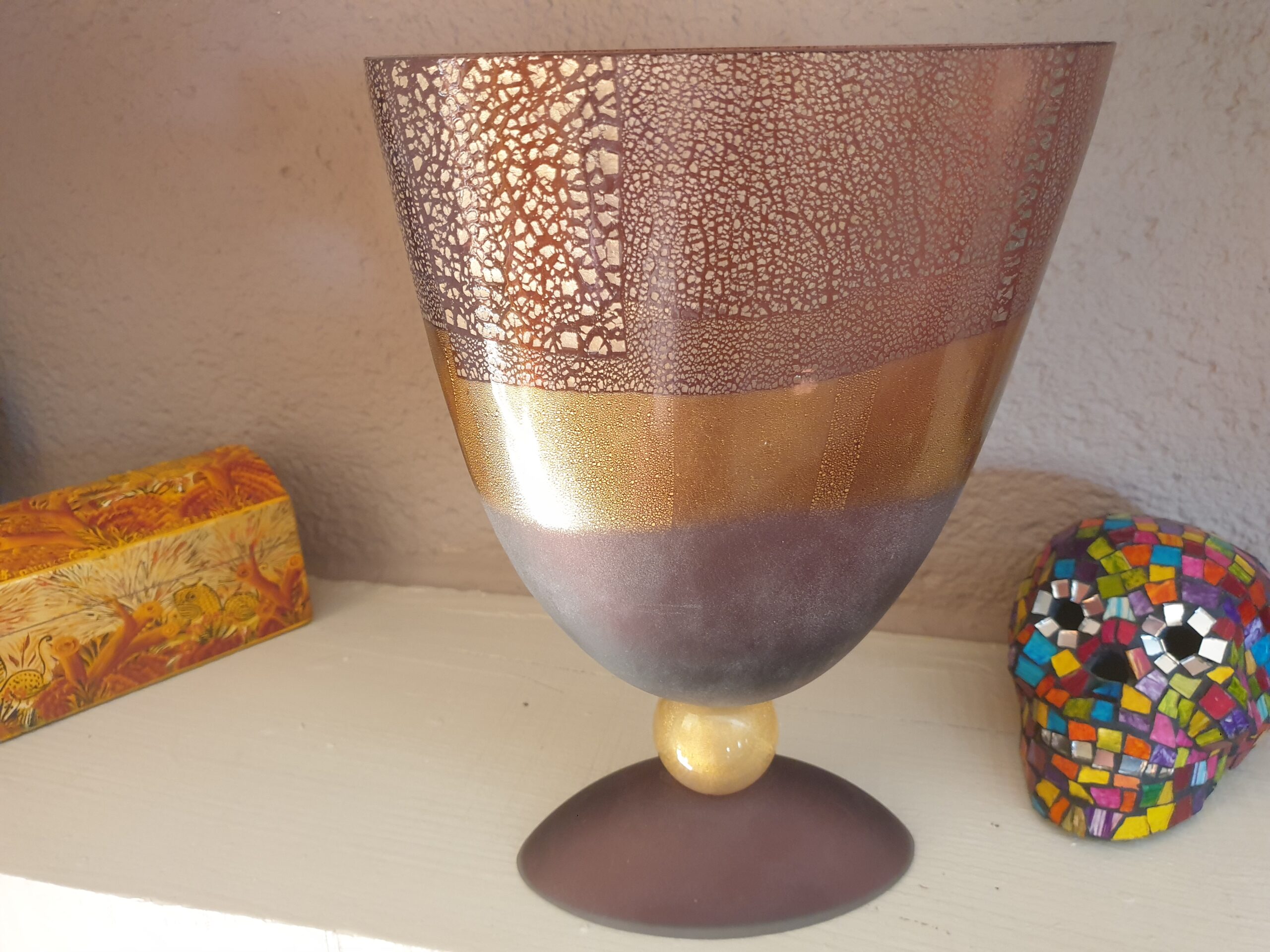 Ce vase de forme gobelet séduit par la subtilité de son verre mauve dépoli, délicatement perlé, rehaussé de reflets dorés. Élégant et raffiné, il évoque l’esthétique précieuse des arts décoratifs de la fin du XIXe et du début du XXe siècle. Une pièce qui capte la lumière et sublime les ambiances.