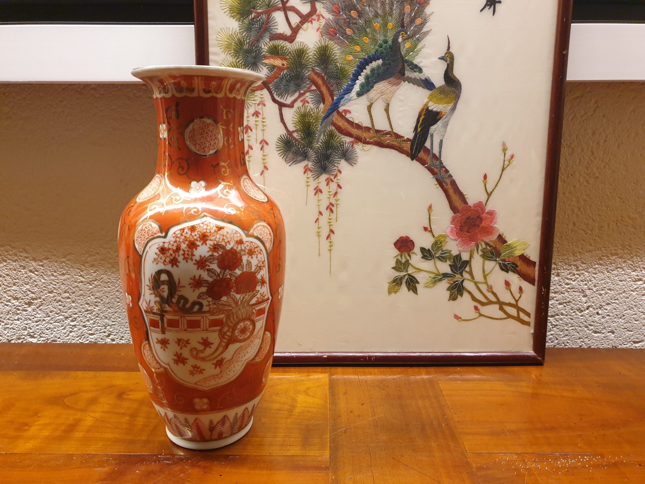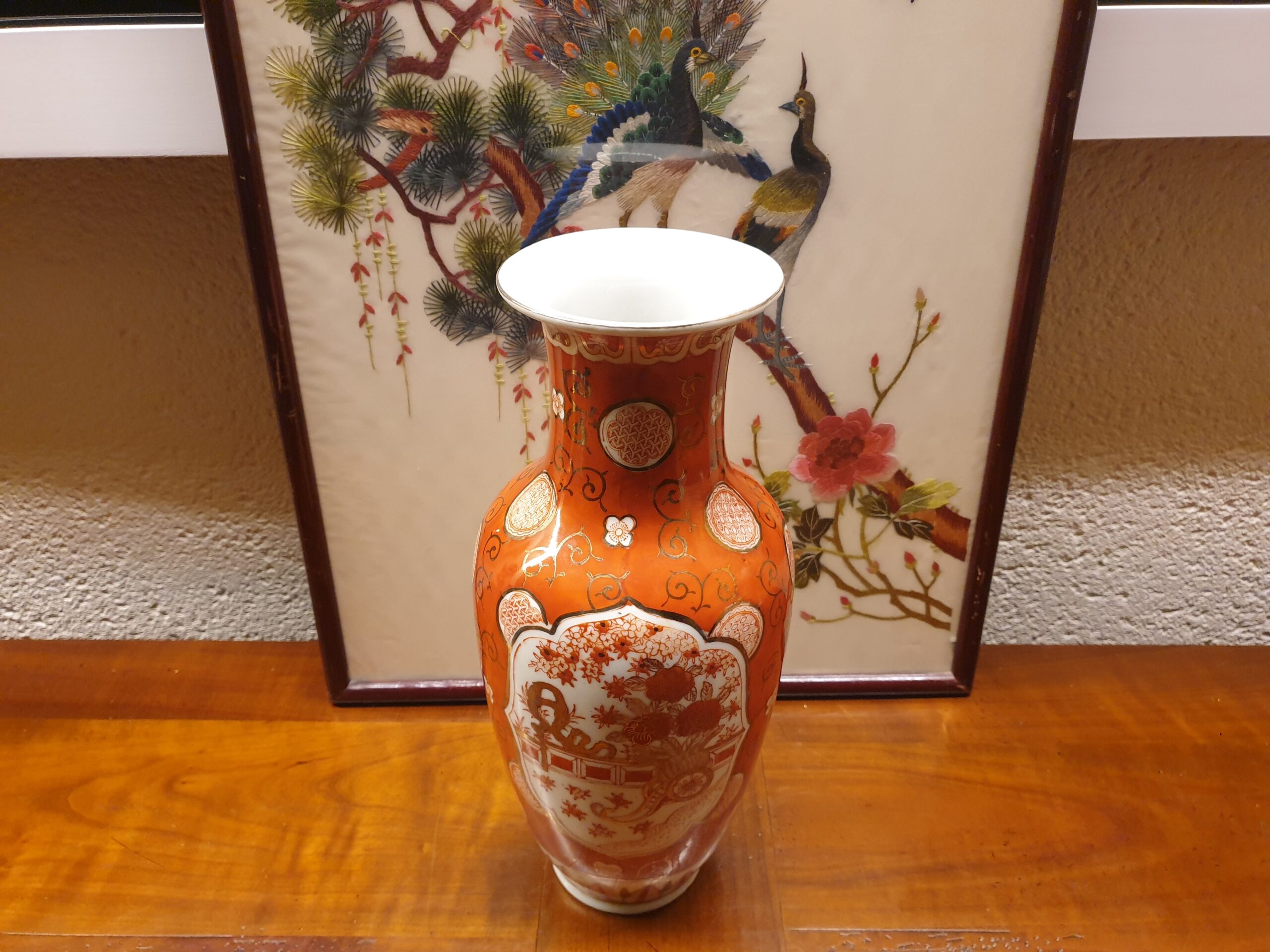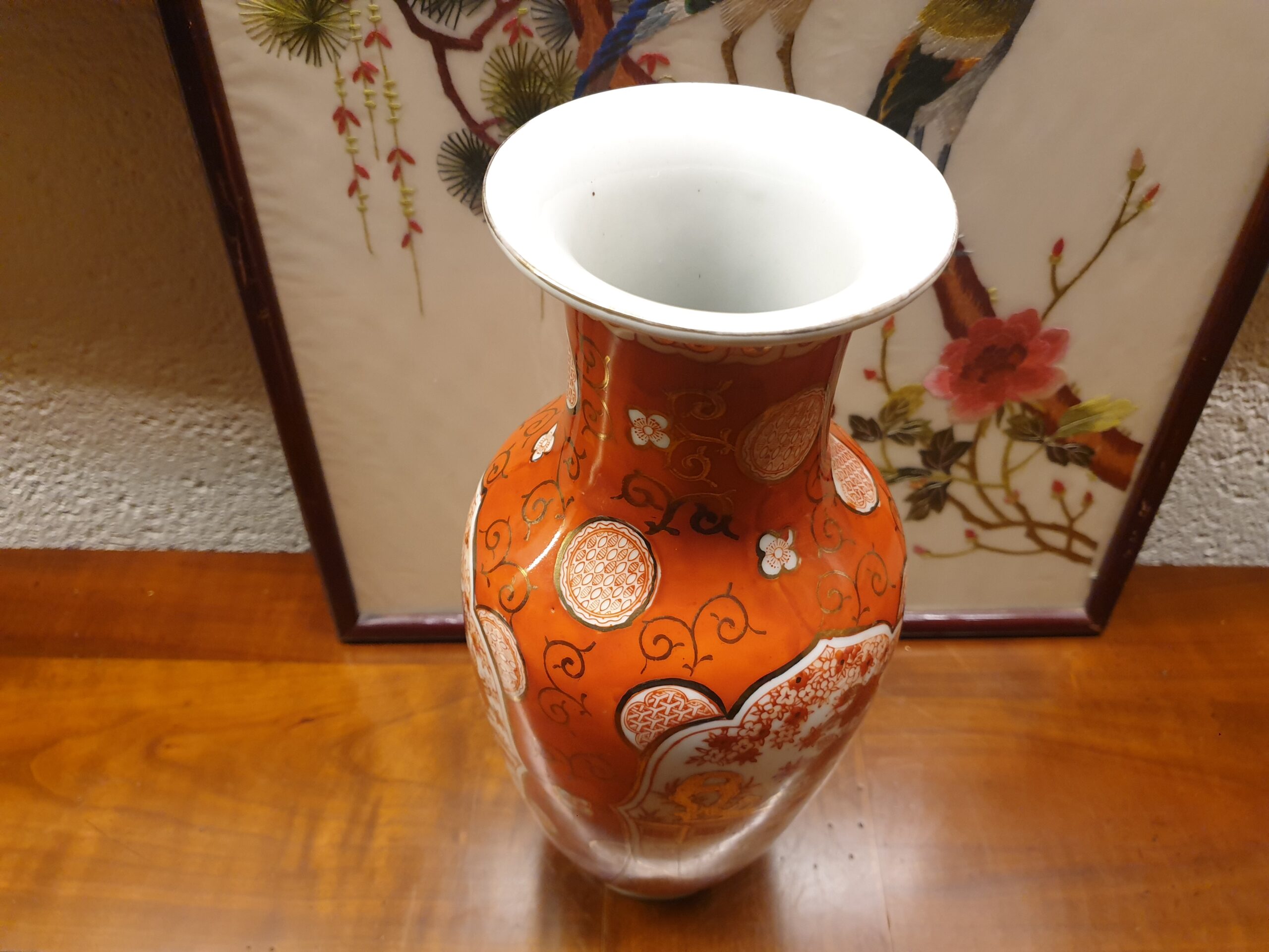 Ce vase en porcelaine de Chine, peint à la main, incarne l’excellence du savoir-faire artisanal asiatique. Ses couleurs éclatantes, orange, doré et blanc, se marient harmonieusement pour créer un décor somptueux. Chaque détail révèle la finesse et la maîtrise des céramistes, offrant une pièce d’exception qui traverse les époques avec élégance.